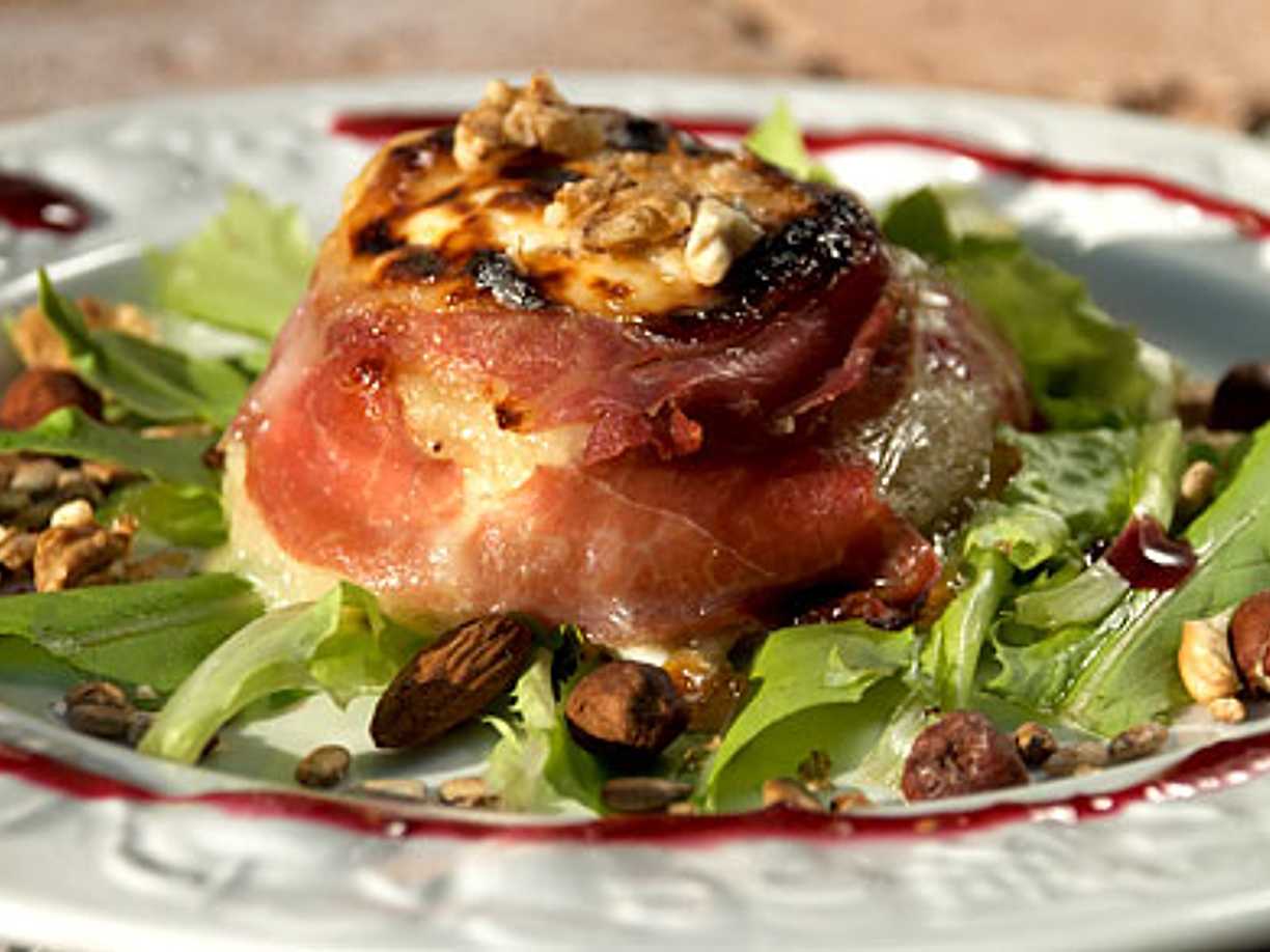 Honungsgratinerad och prosciuttolindad chèvreost