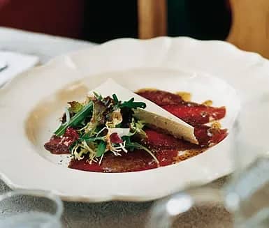 Champinjoncarpaccio med jordärtskockschips, citronmajonnäs och hasselnötter