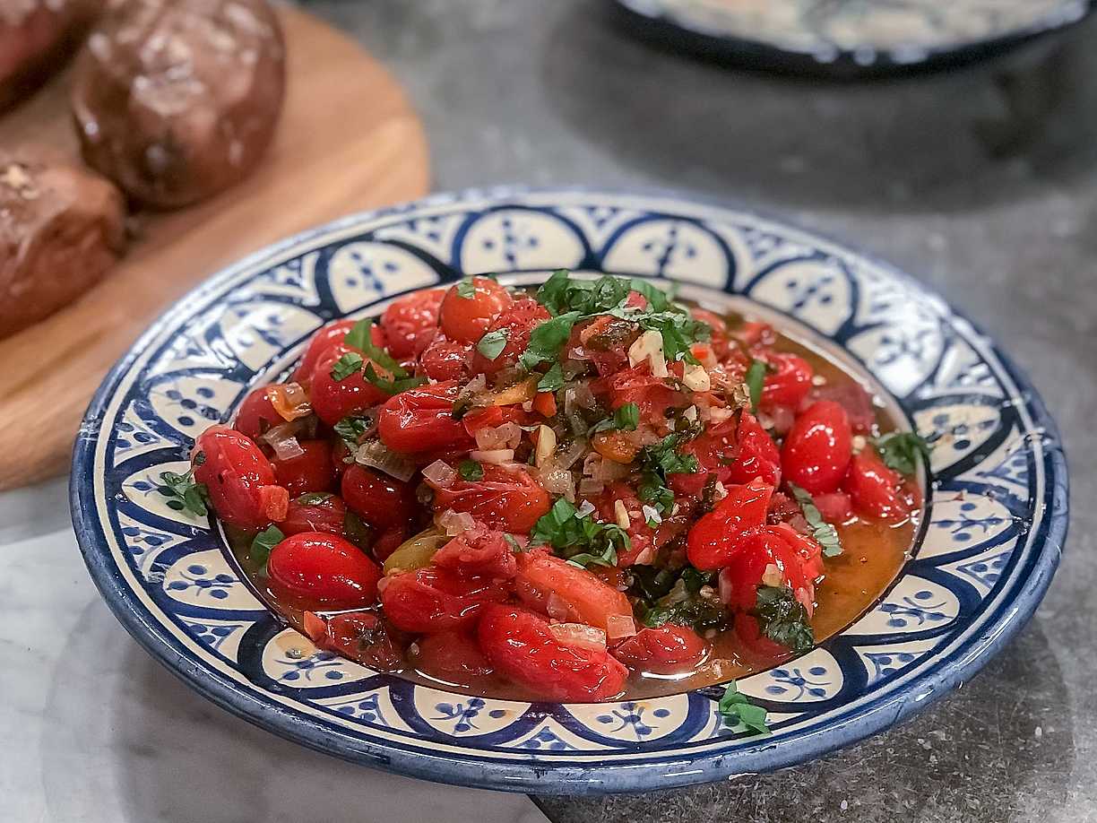 Fyllda bifftomater med fetaost, oliver och chili