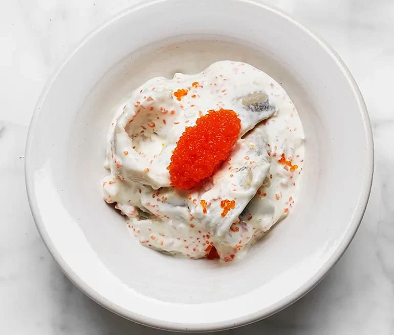 Evas ostkroksbakelse med färska räkor och svart kaviar