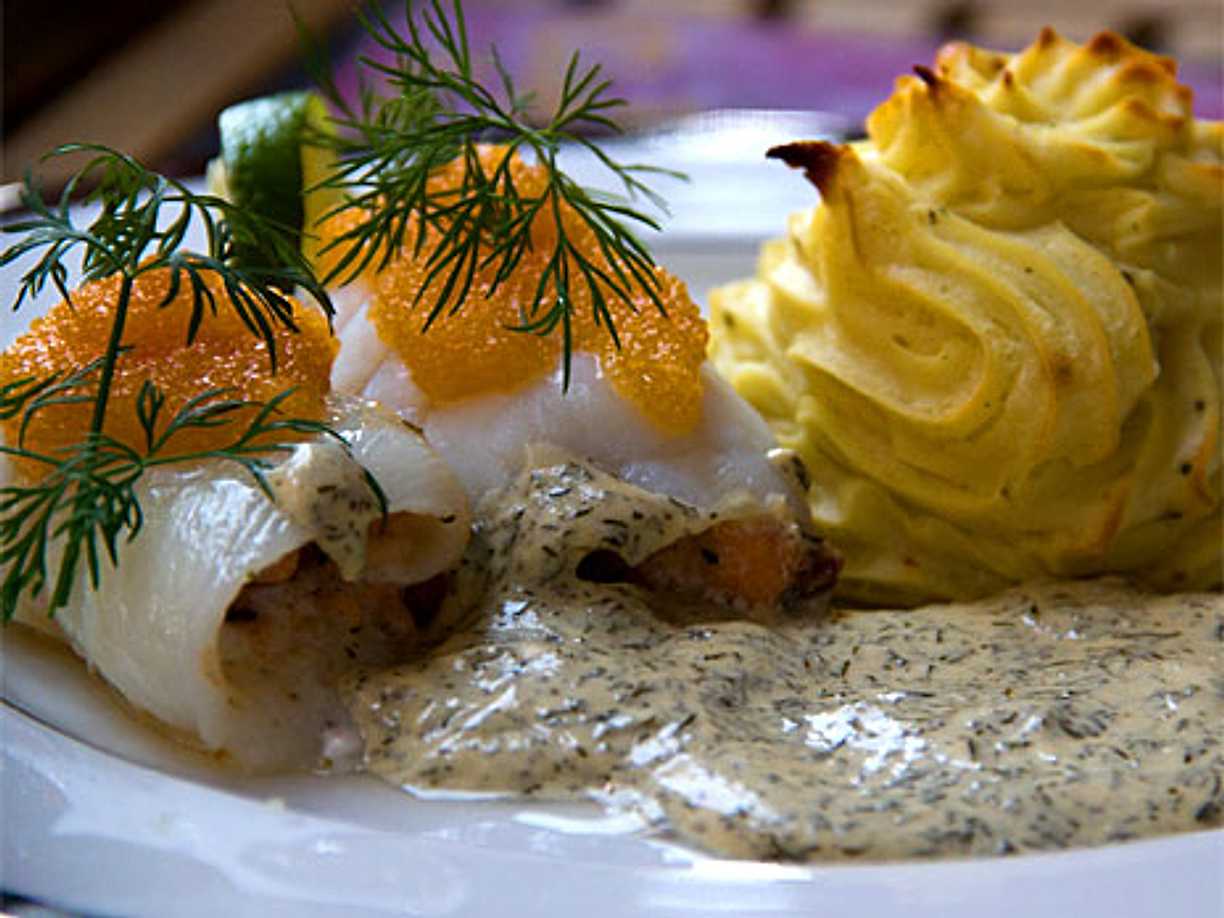 Laxfylld och löjromstoppad rödtungefilé.