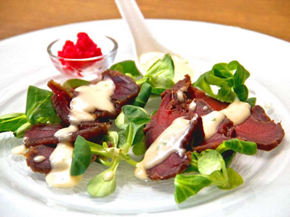 Carpaccio à la russe med rödbetor, kapris, pepparrot och amandinepotatis