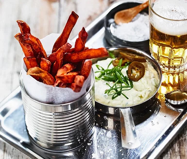 Sötpotatis-pommes frites med jalapeñodip