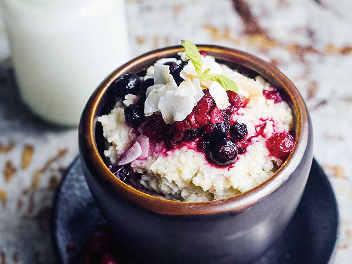 Dinkelgröt med blåbär och sojamjölk