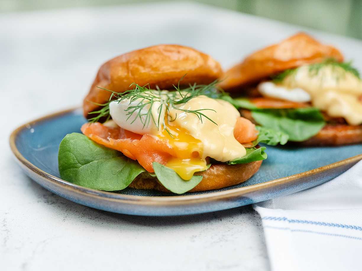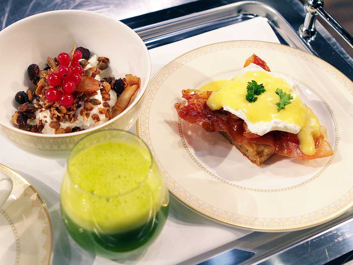 Eggs Benedict, yoghurt med granola och apelsin- och spenatjuice