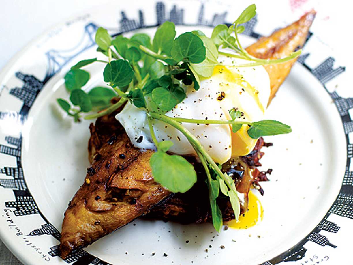 Bacon- och zucchiniplättar med stekt ägg och avokadomajo