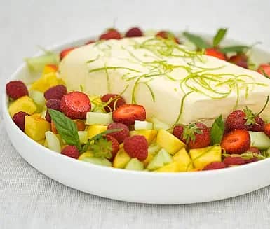 Vit chokladparfait med limemarinerad frukt och bär