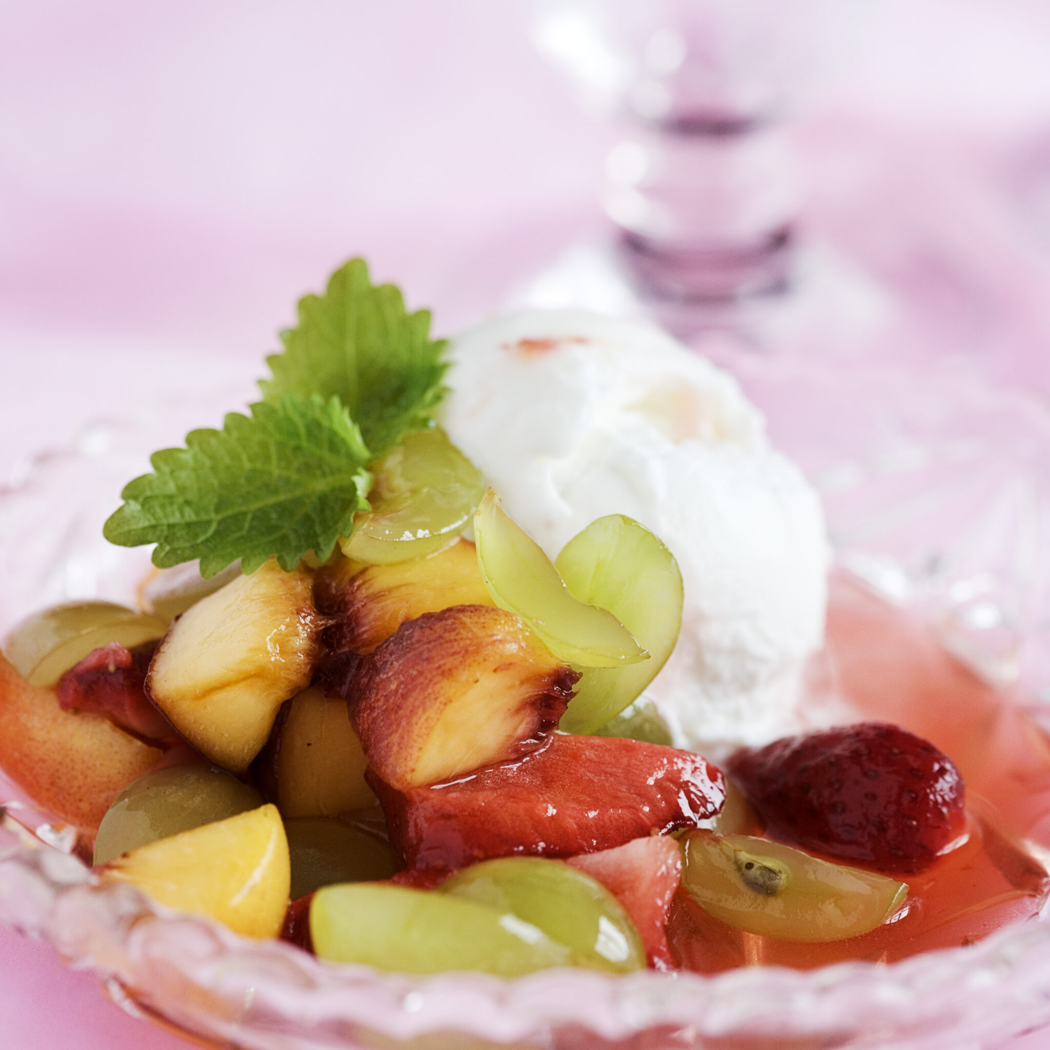 Citrus- och ingefärsmarinerad frukt med kokosglass