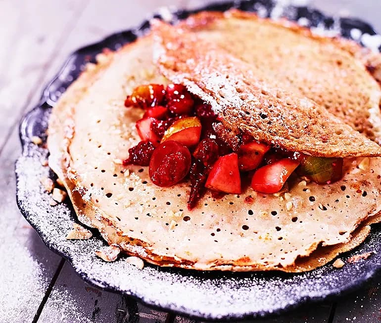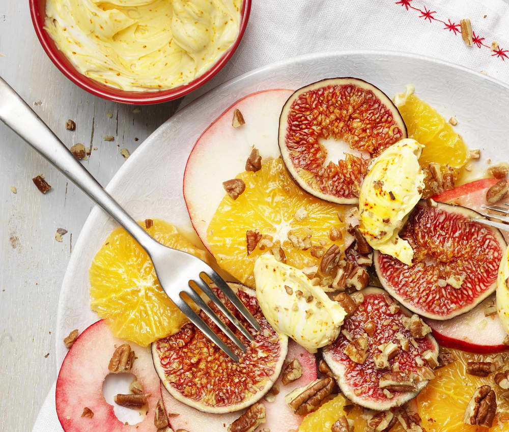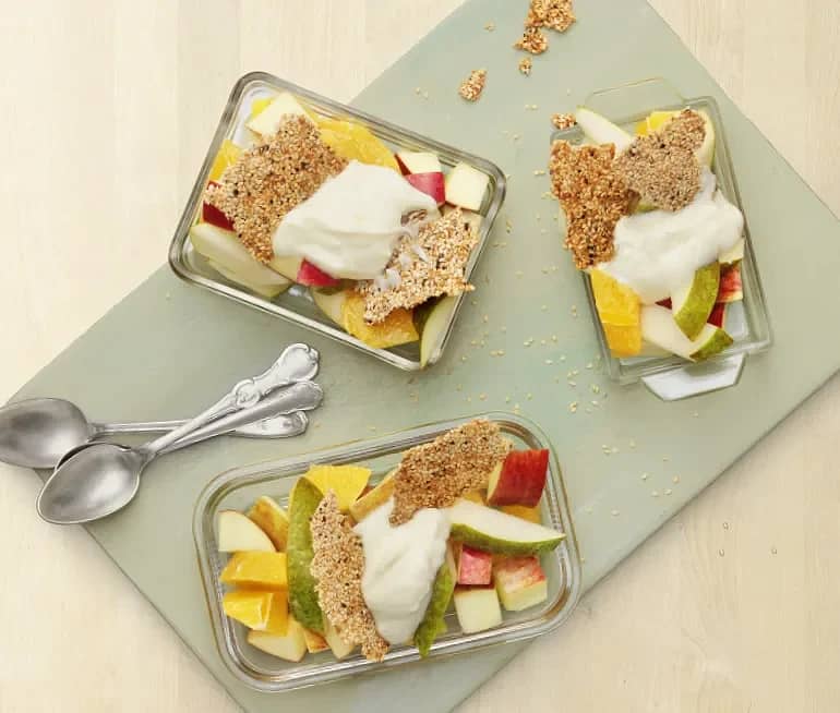 Somrig fruktsallad med vit chokladkräm och karamelliserade havregryn