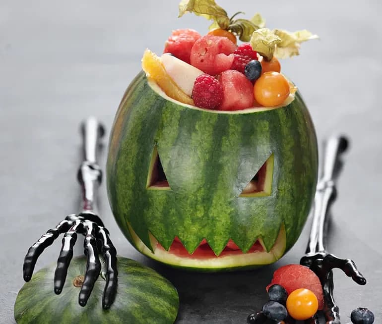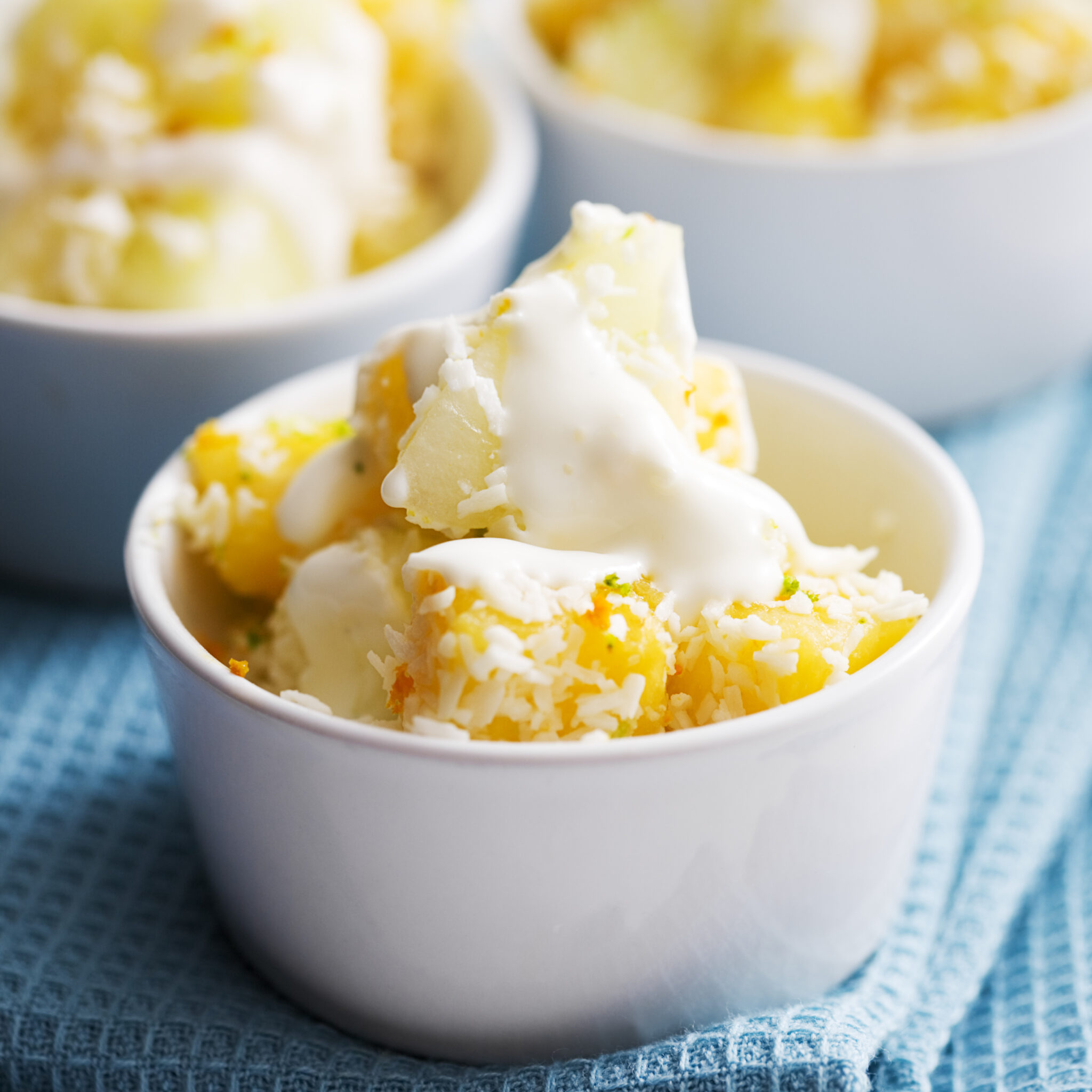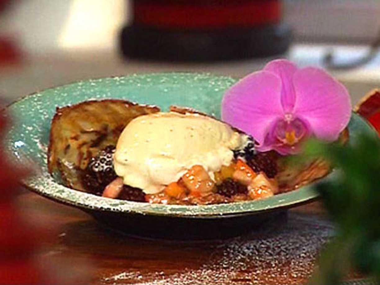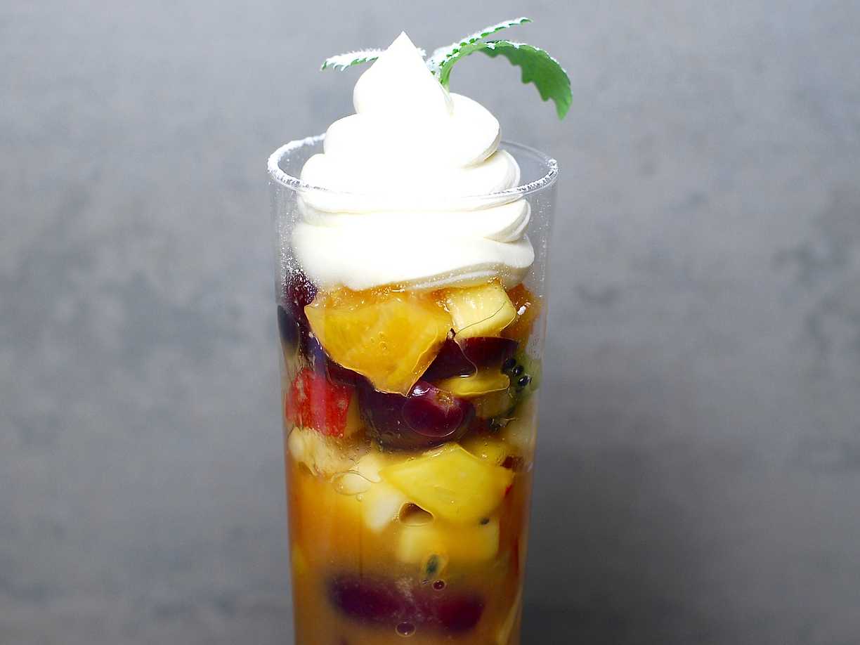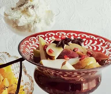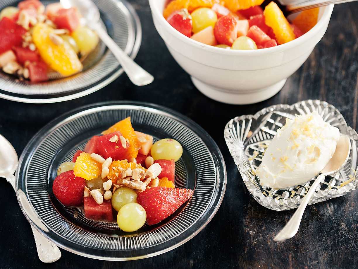 Wokad fruktsallad med vaniljglass och mascarponegrädde