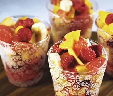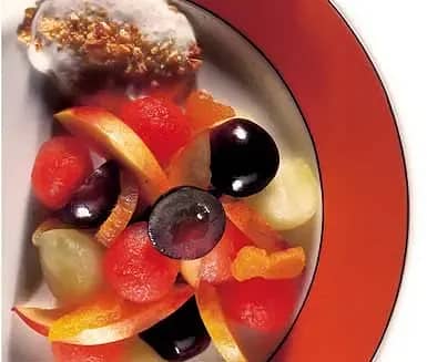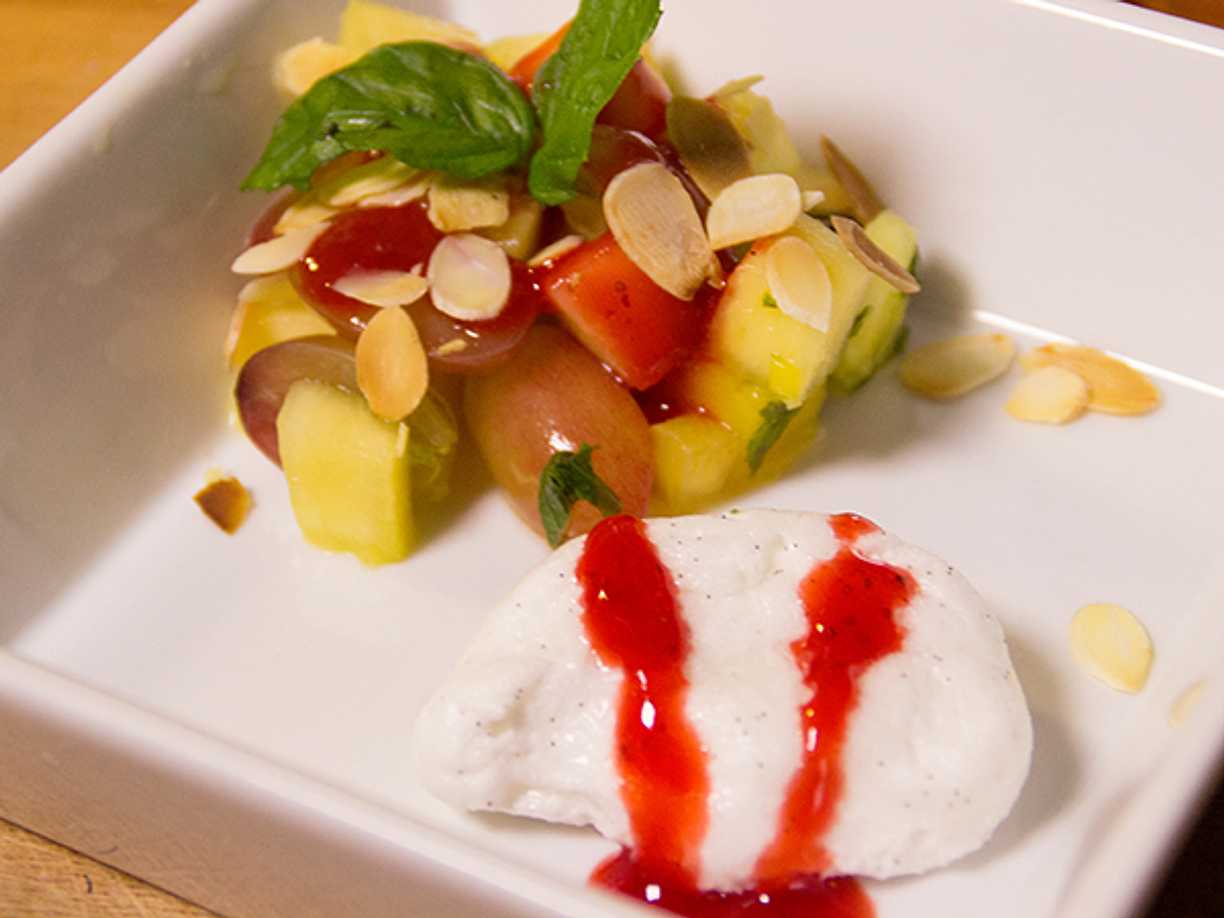 Fruktsallad med mangosorbet, grapefruktsorbet, vaniljglass och hasselnötsskorpor