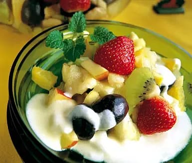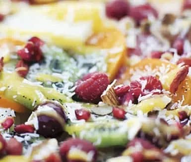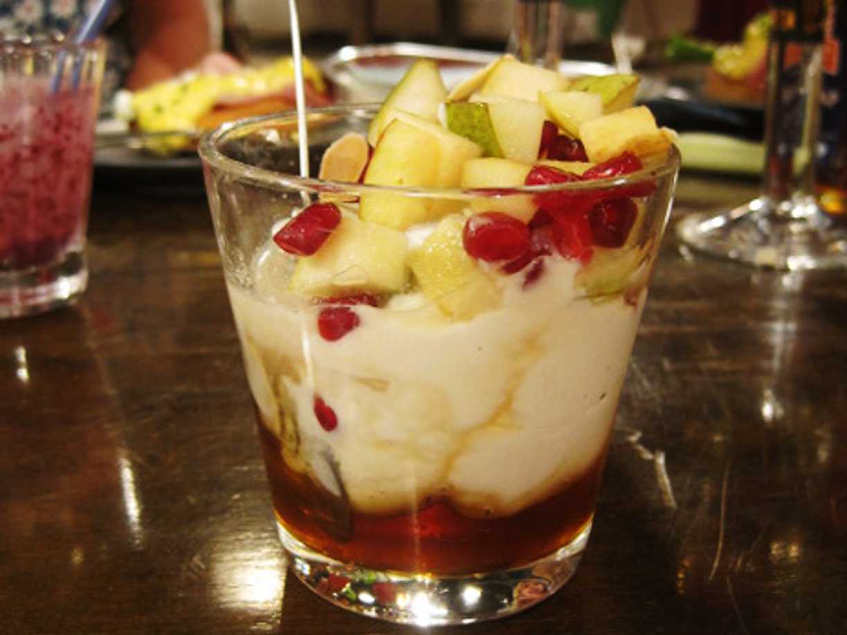 Fruktsallad med yoghurt, honung, granatäpple och mandel