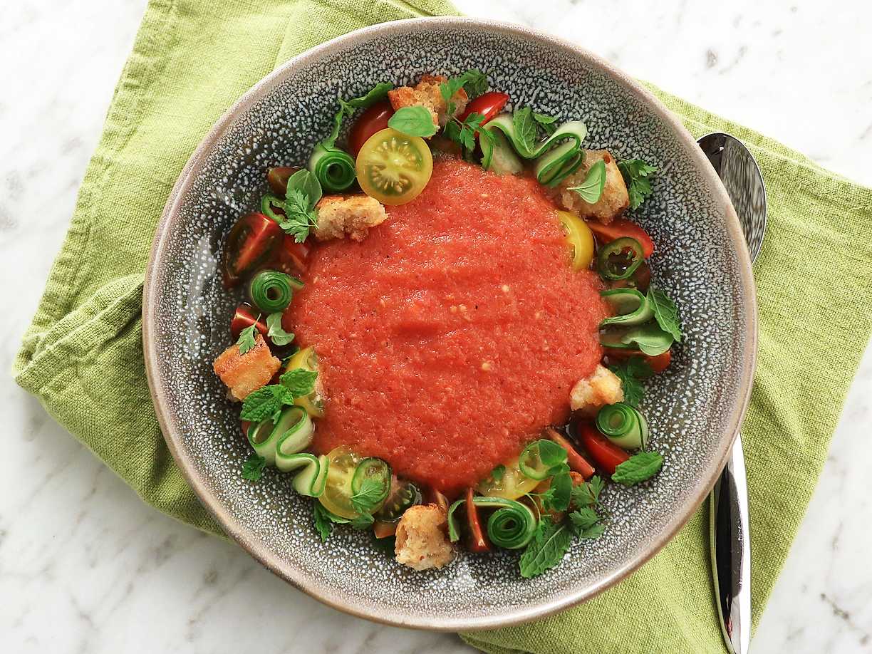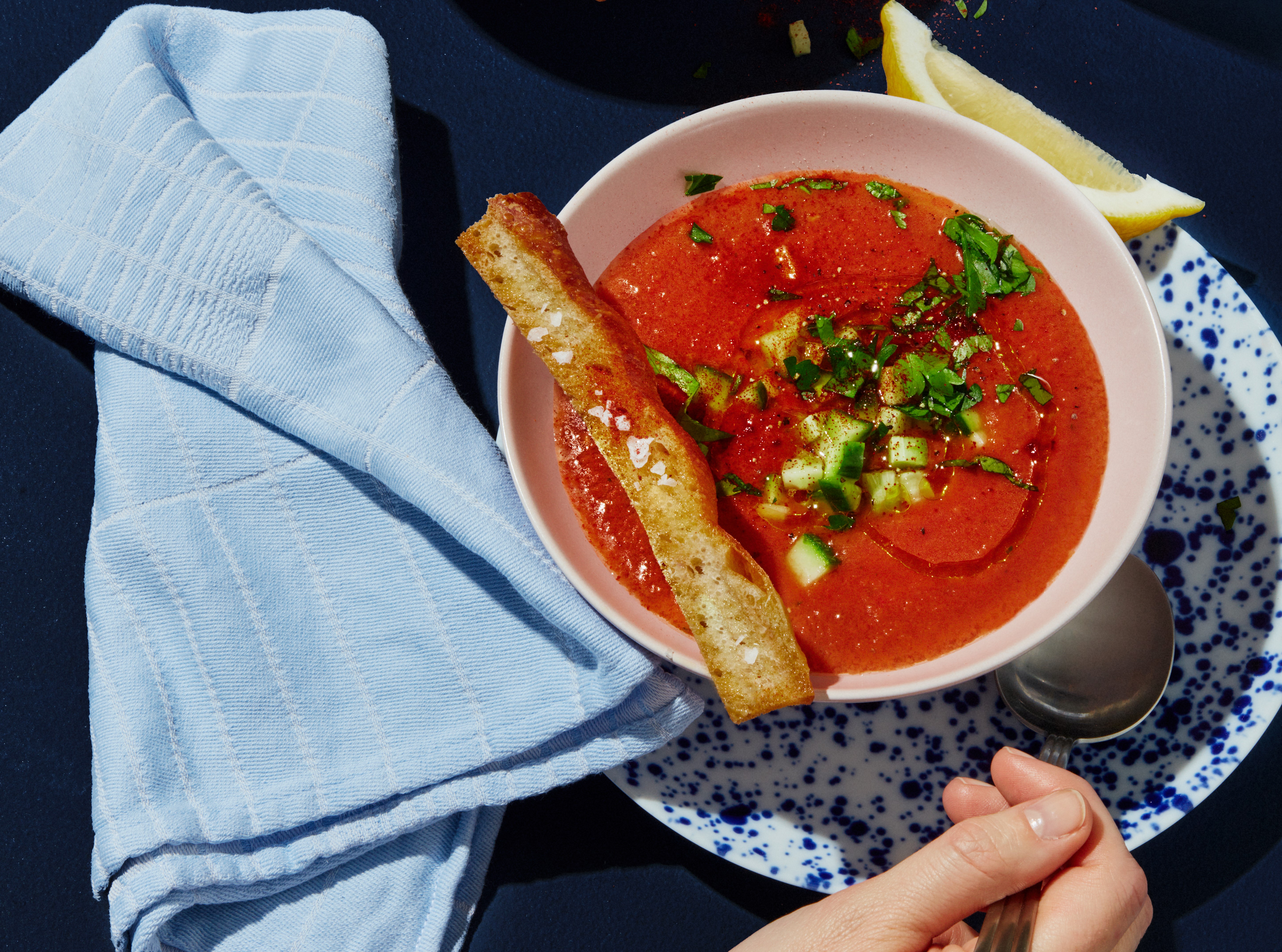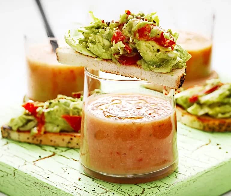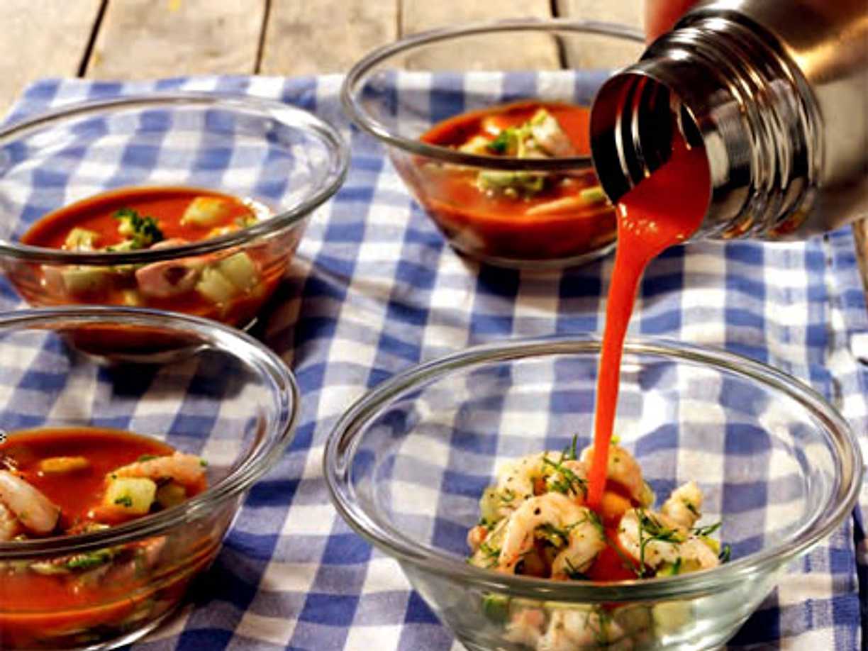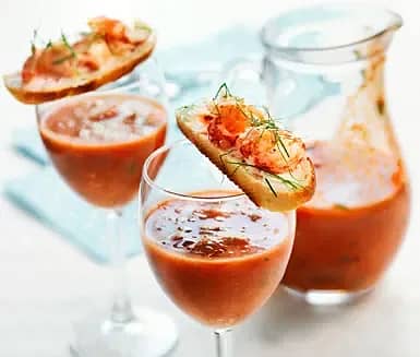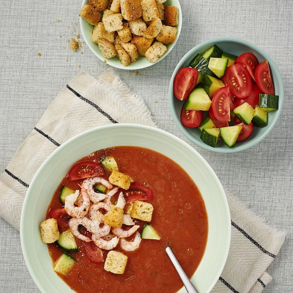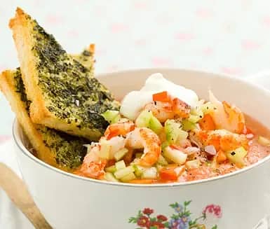 Svalkande gazpacho med kräftstjärtar och örttoast