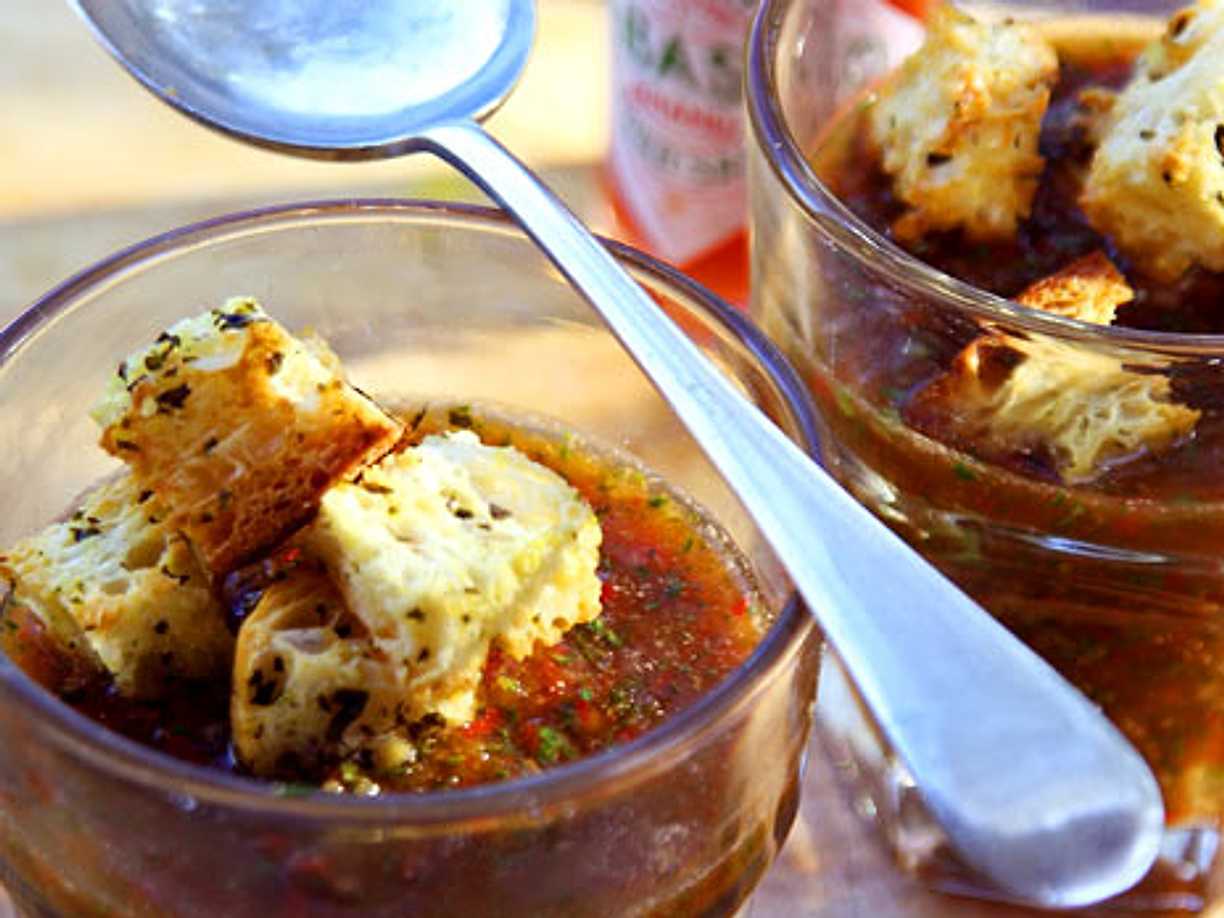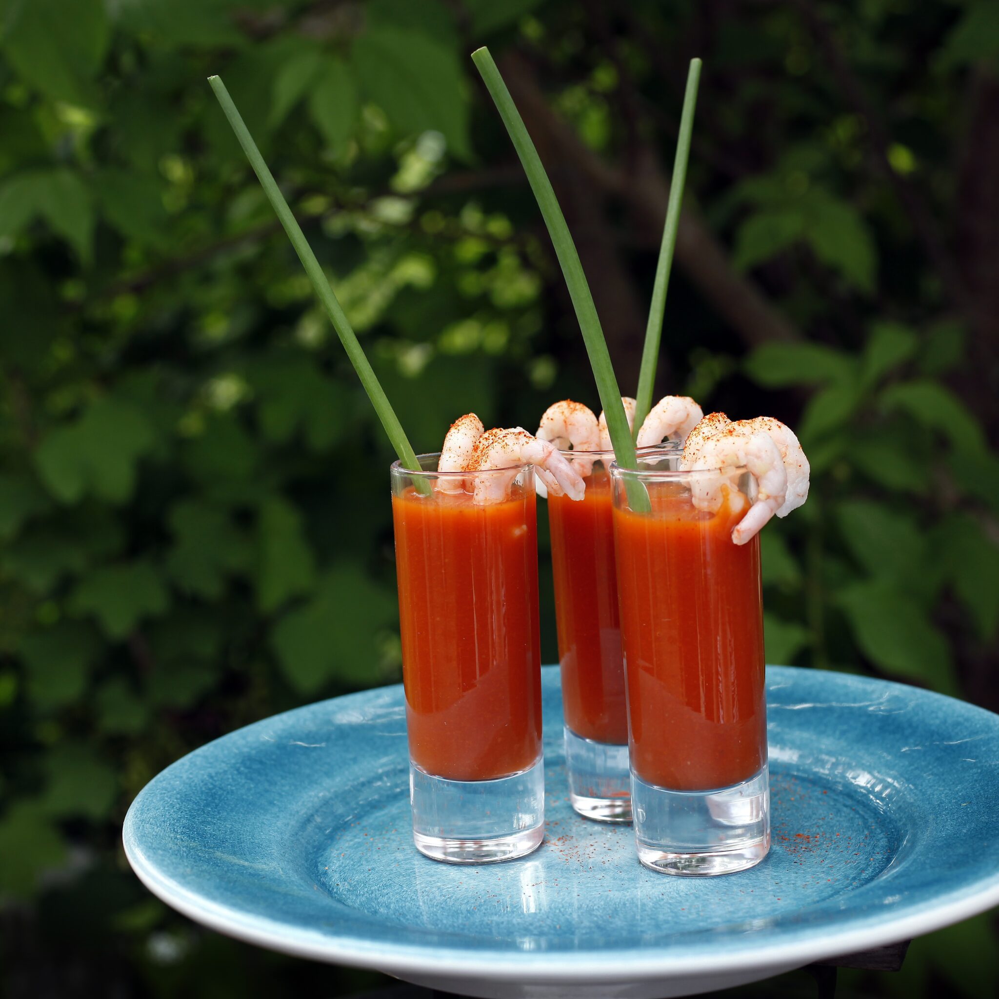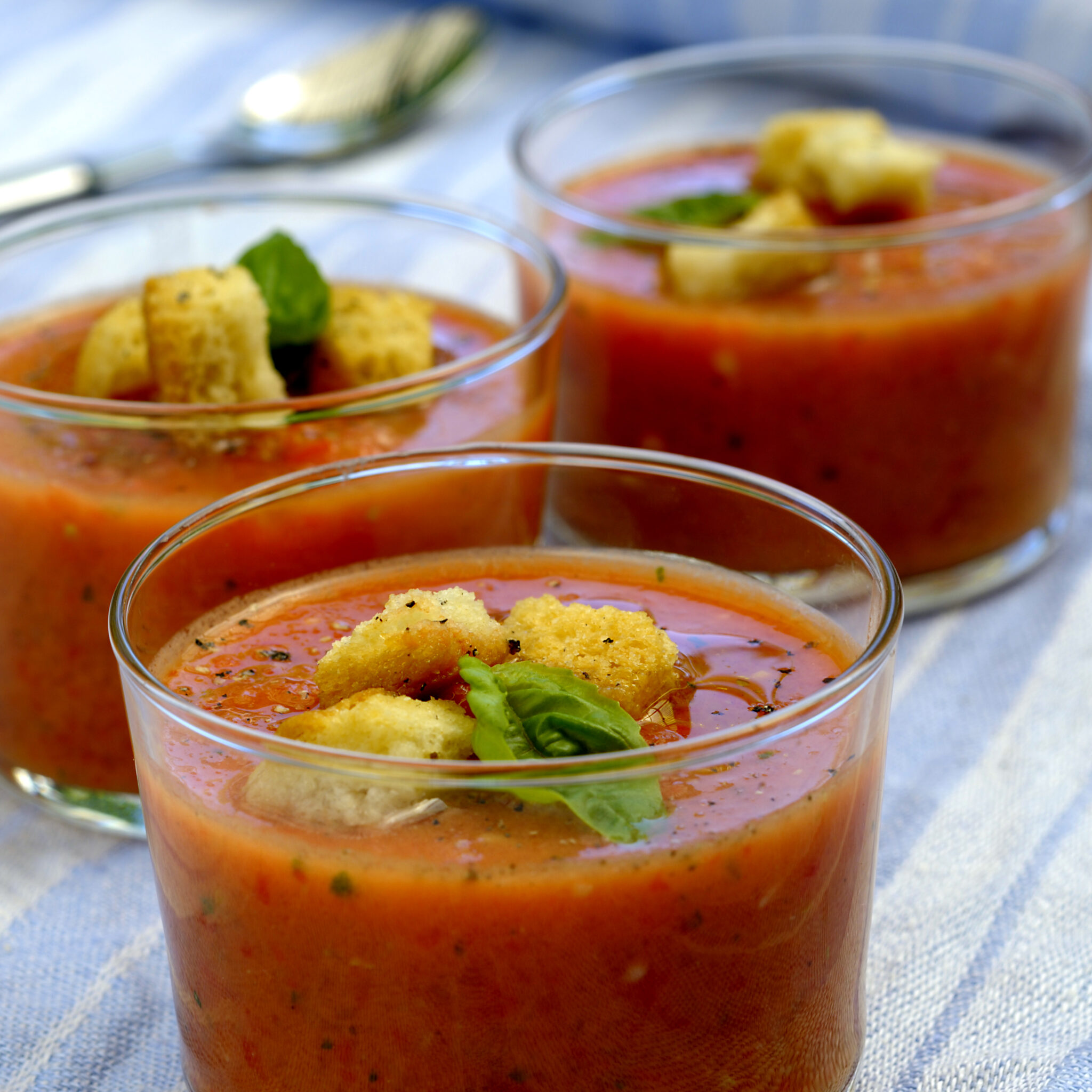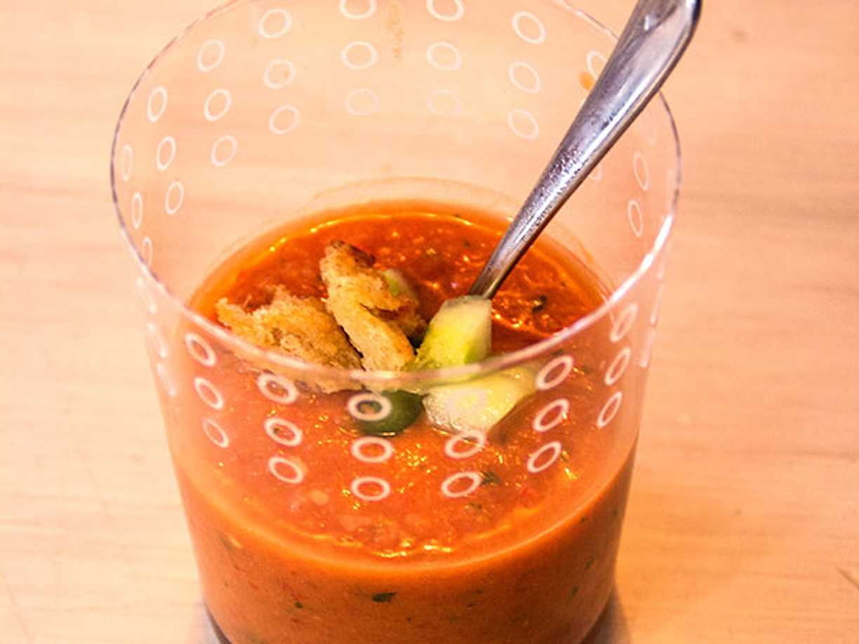 Svalkande gazpacho med kräftstjärtar och örttoast