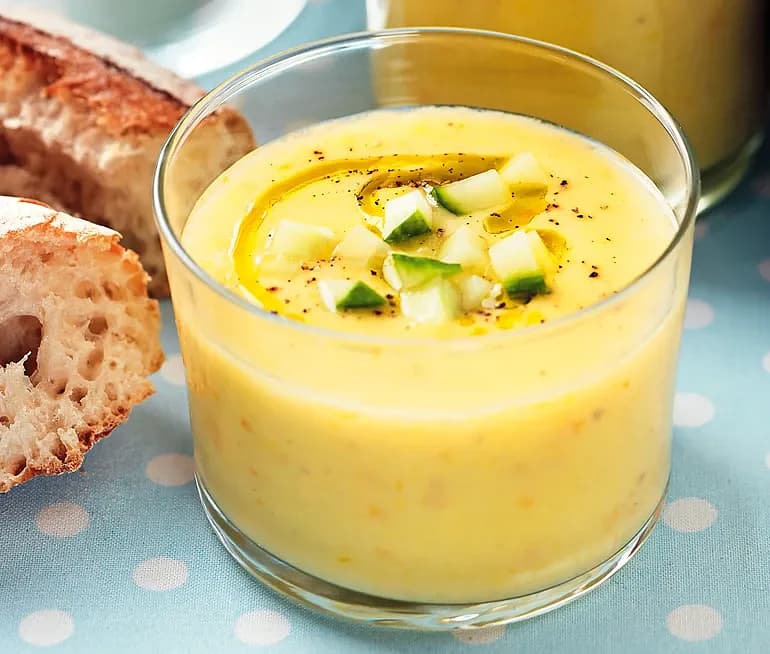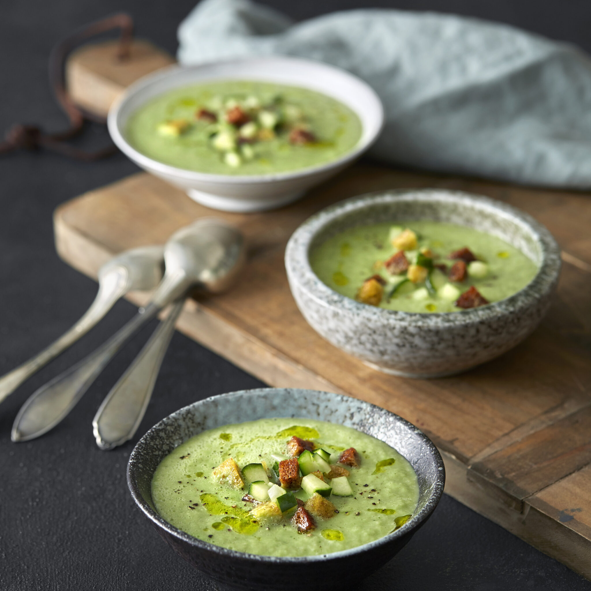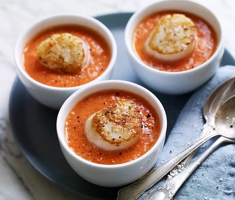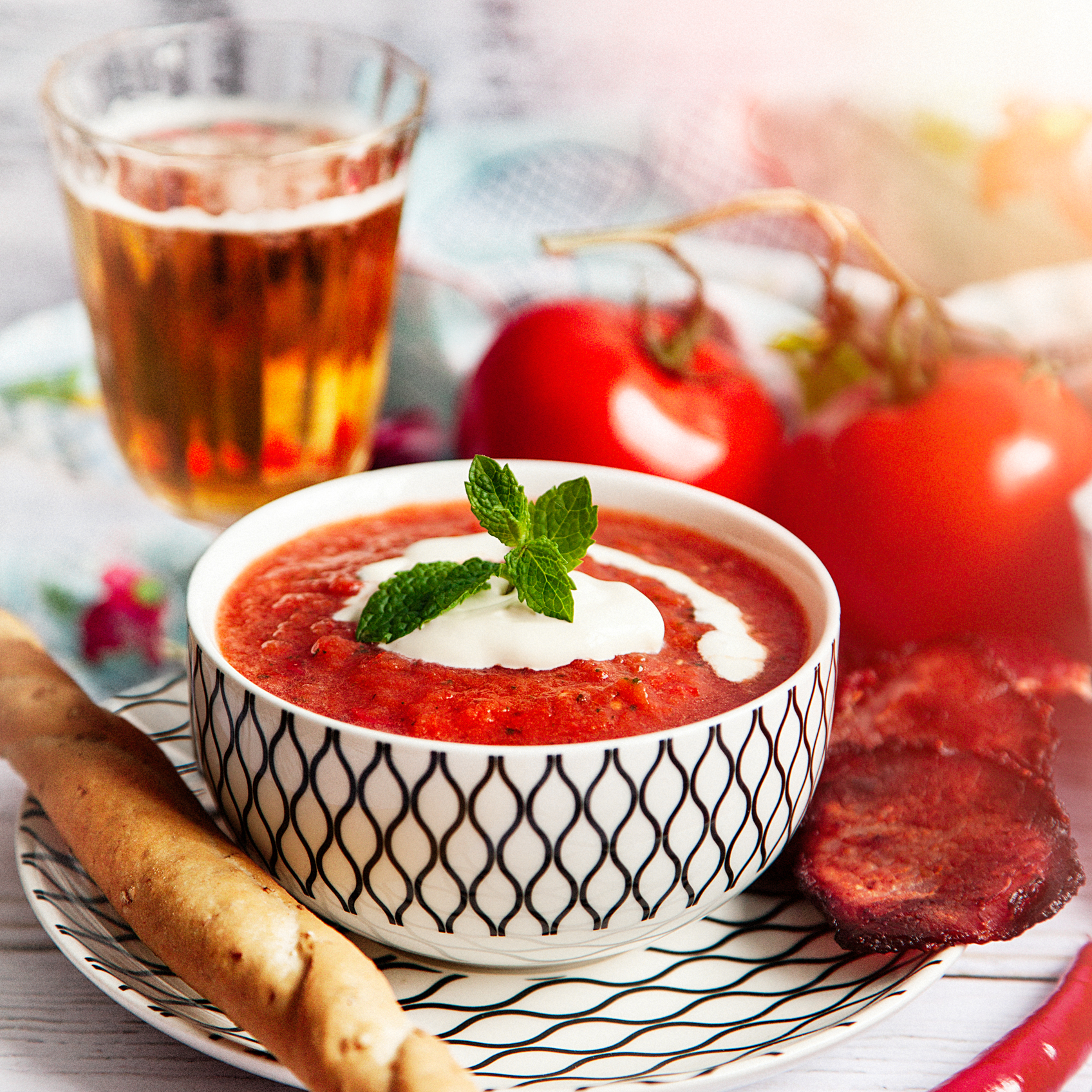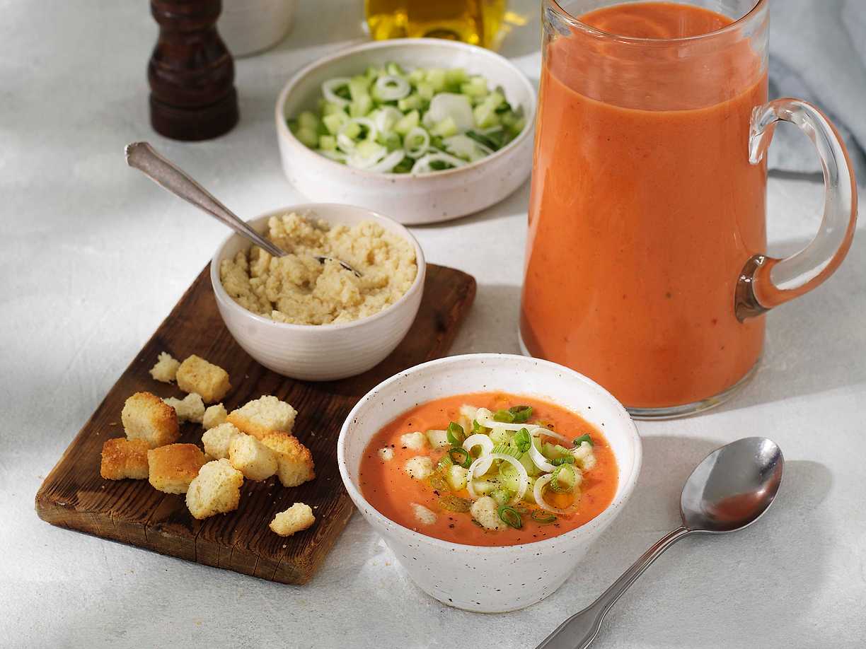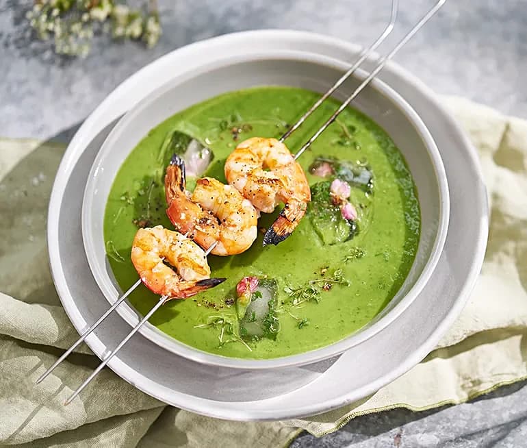 Svalkande gazpacho med kräftstjärtar och örttoast