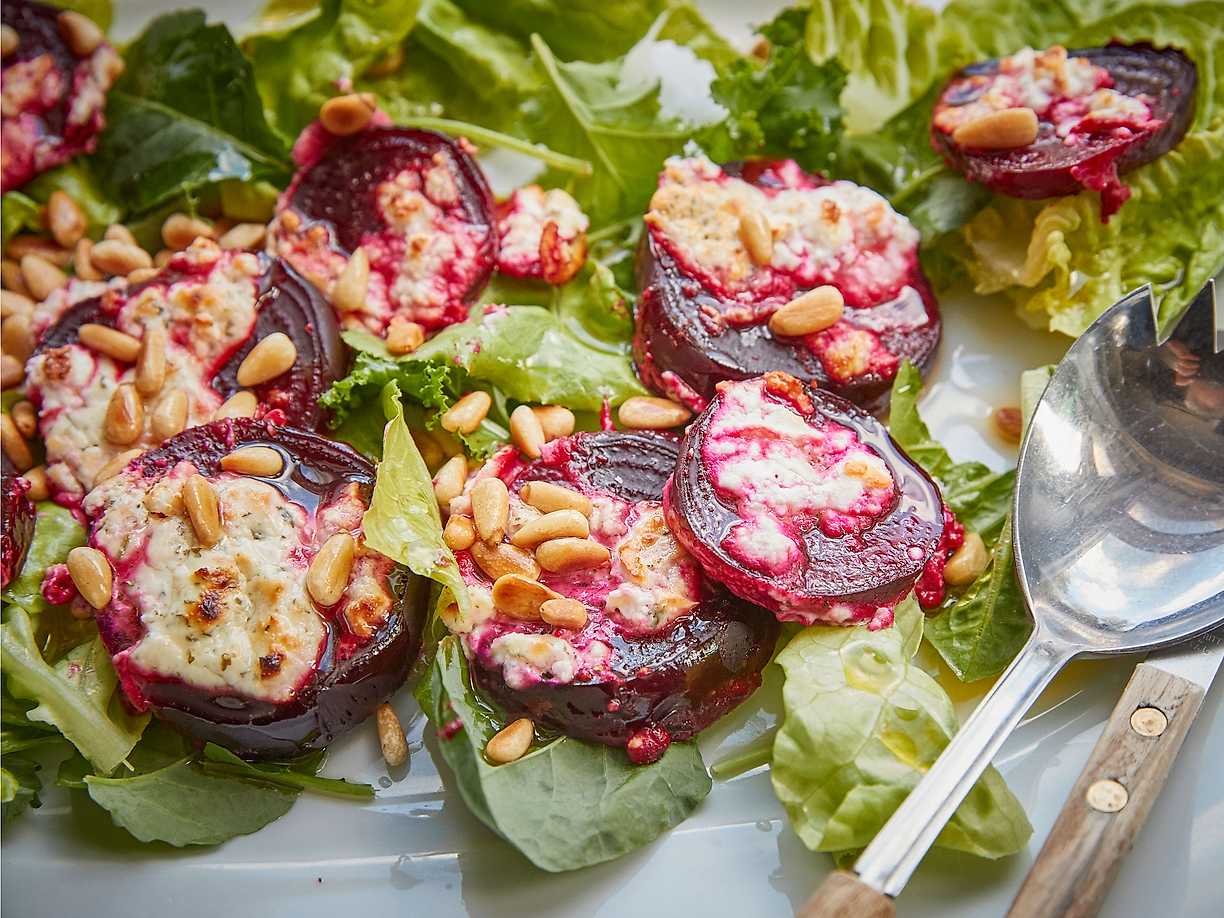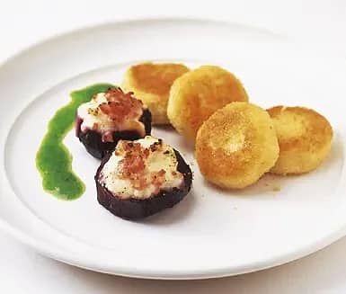 Potatisbullar med getostgratinerade rödbetor och örtsås