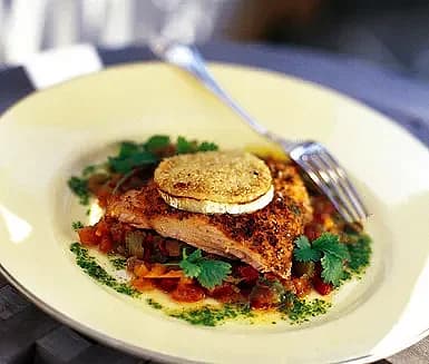 Parmalindad laxfilé med getostgratinerade gulbetor och rödvinssås