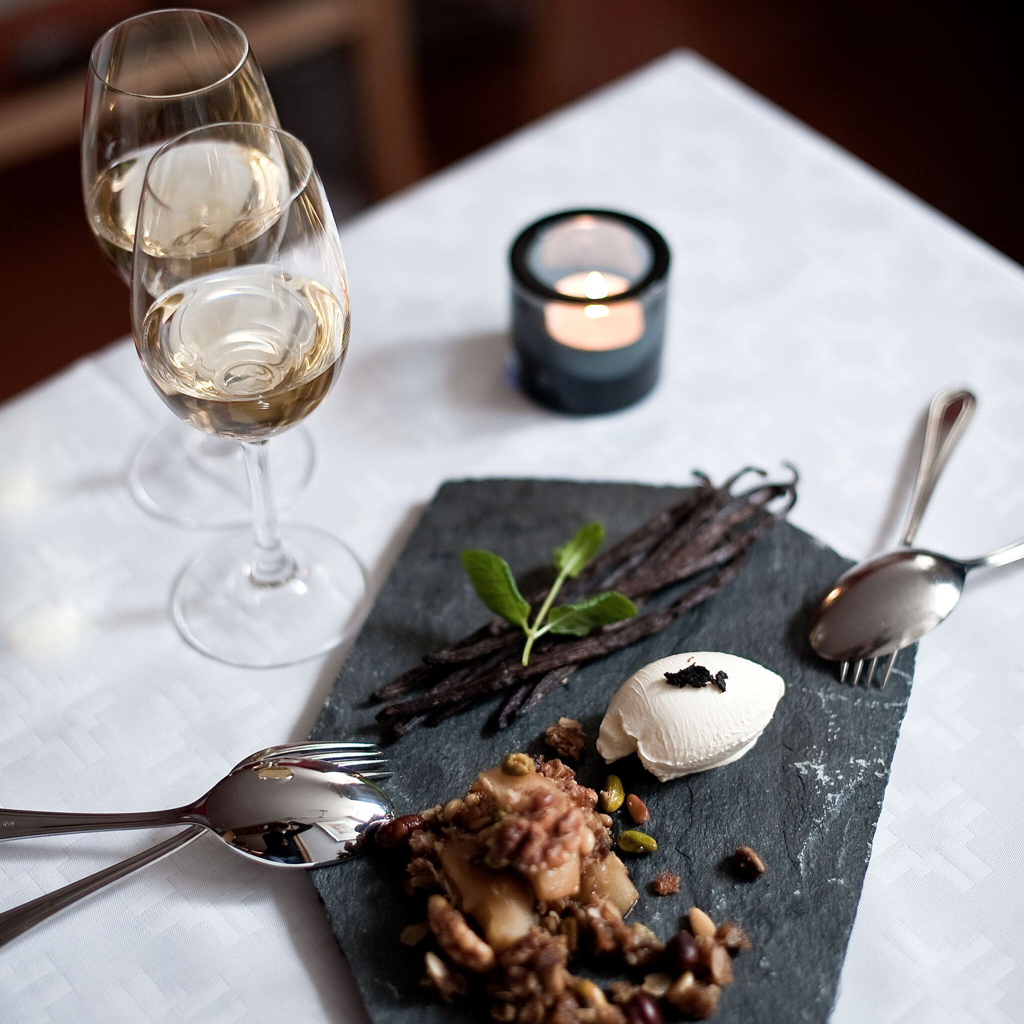 Glass med saltrostade mandlar och varm chokladsås