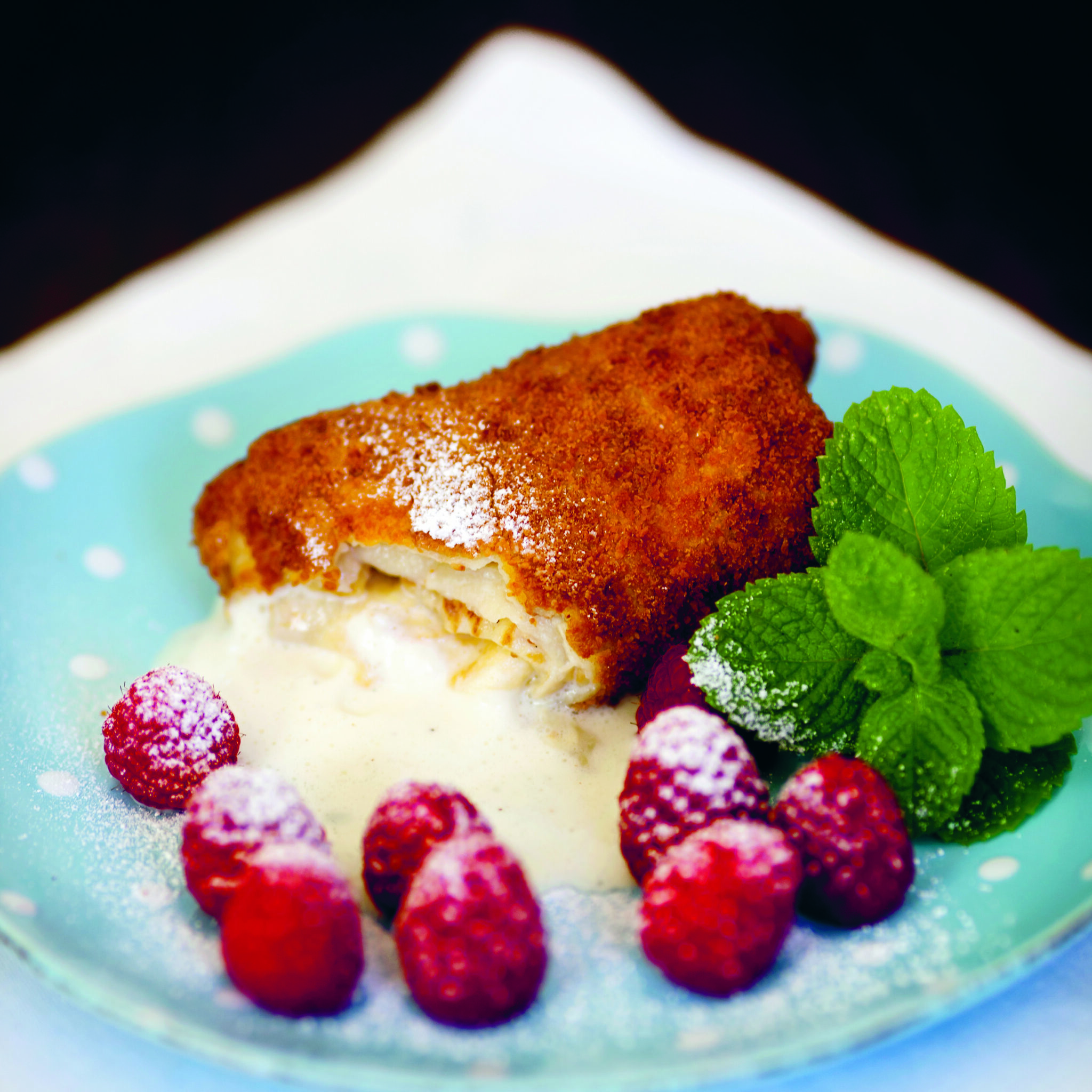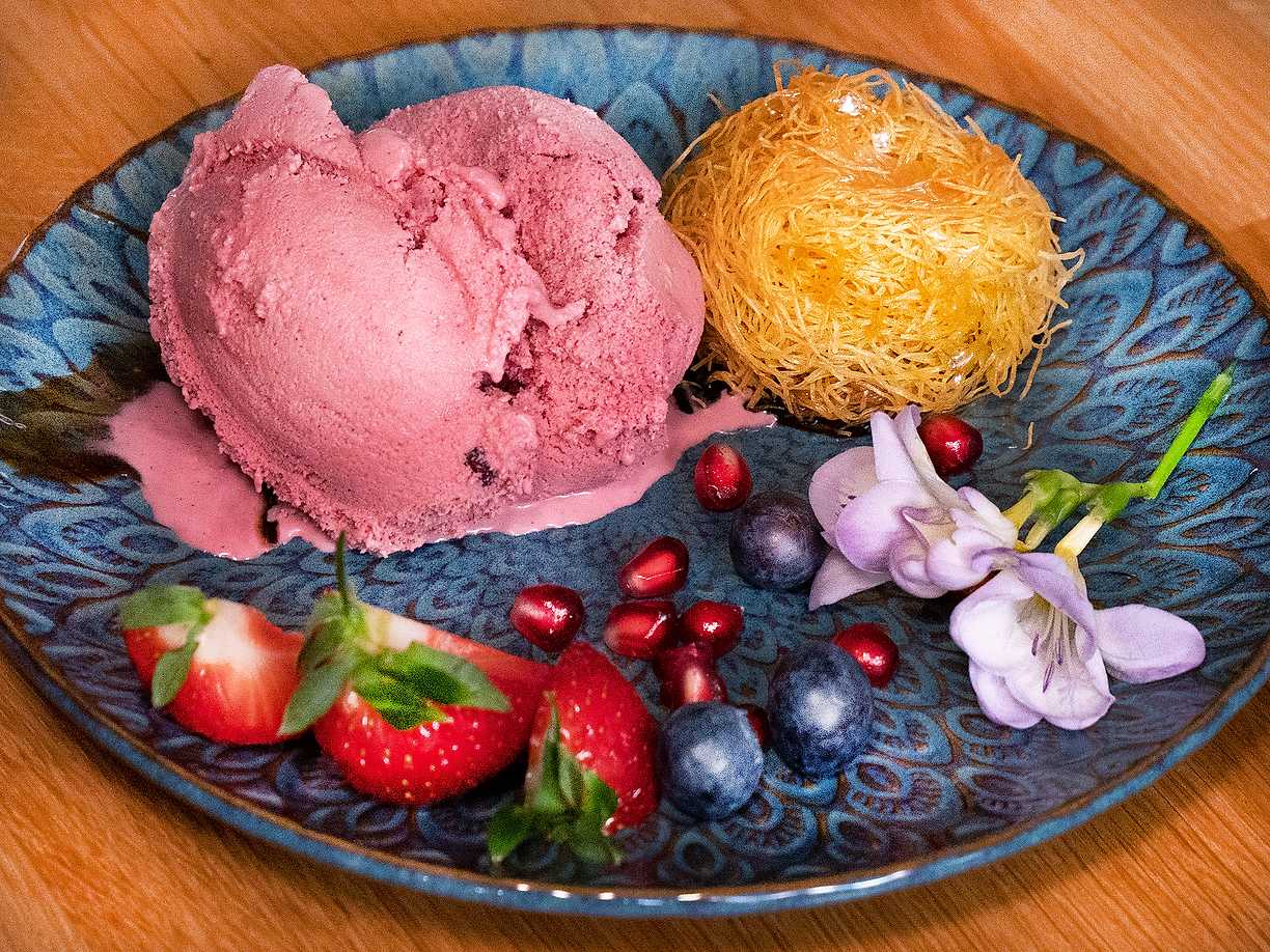Friterad kladdkaka med glass och bär