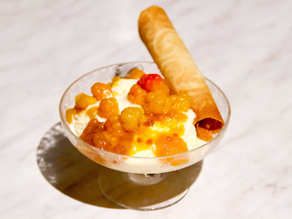 Smörstekt sockerkaka, hjortron och glass på brynt smör