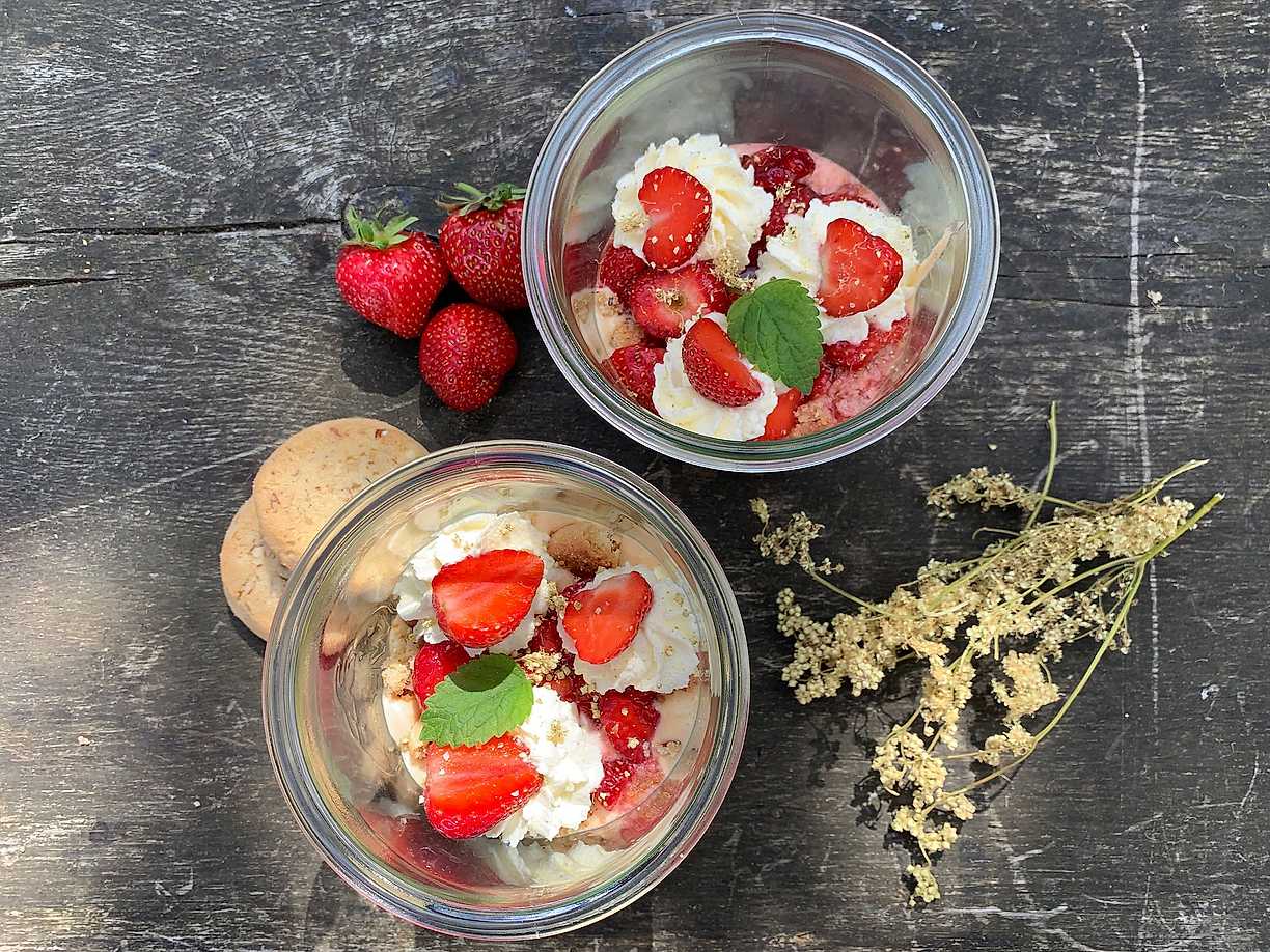 Jordgubbsmousse i glas med bondkakor och älgört