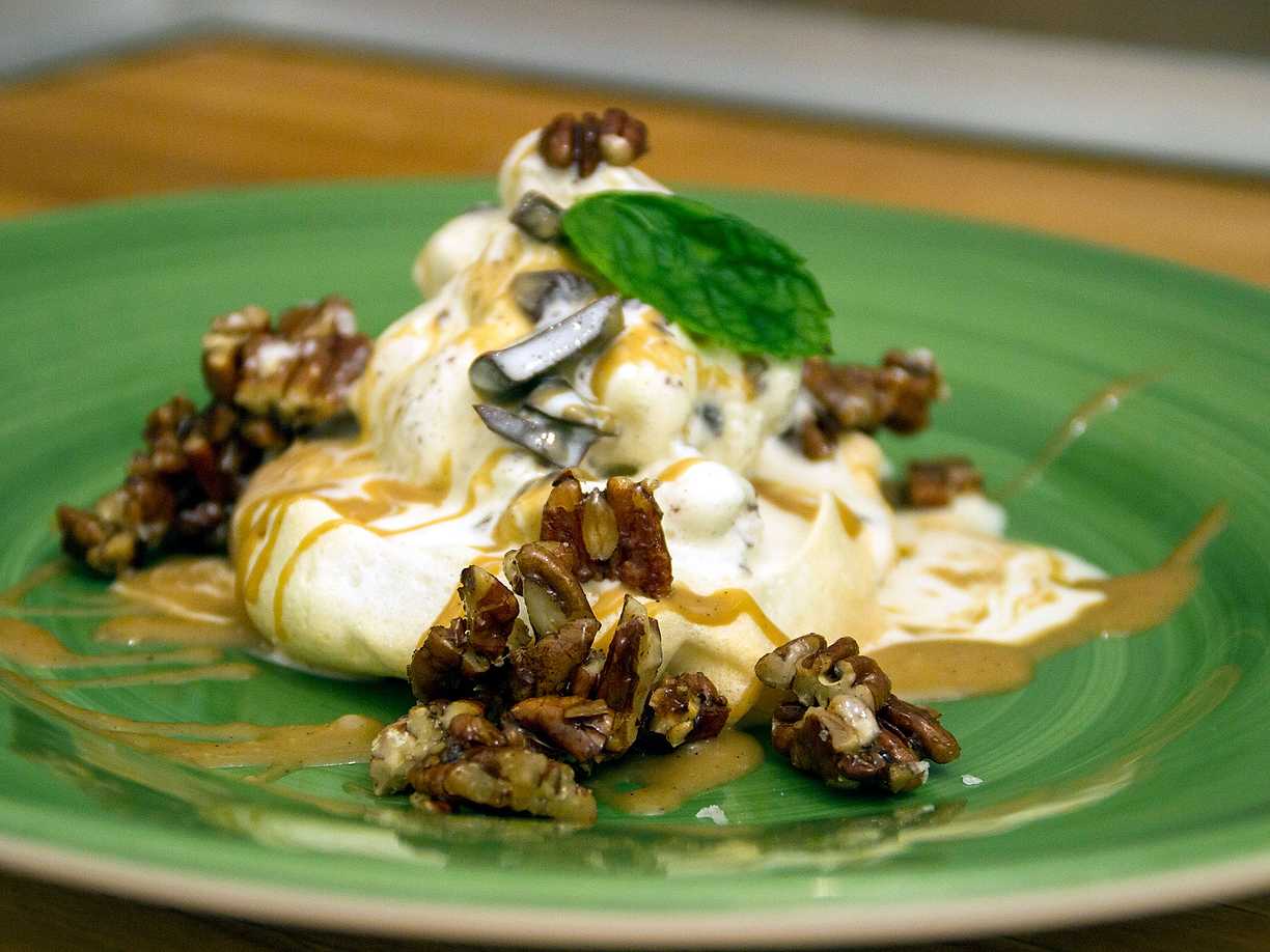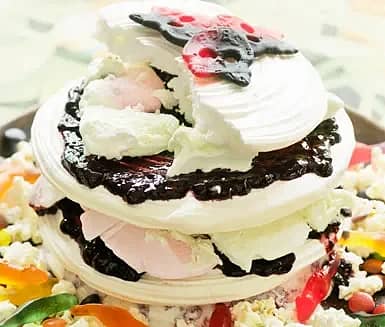 Marängbakelse med kanderade nötter och glass