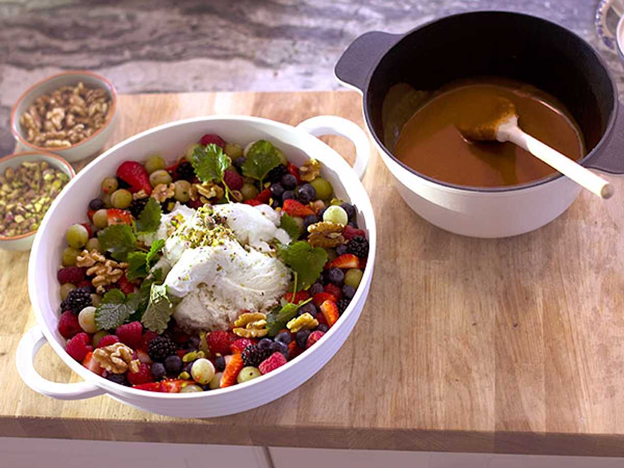 Färska bär med karamellsås och glass
