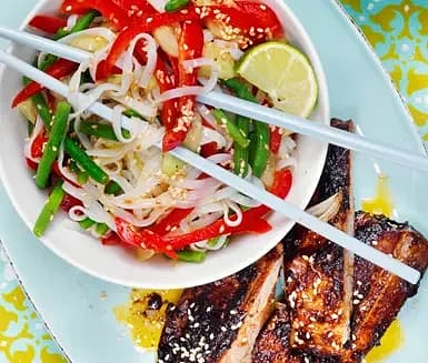 Ugnsbrässerade revben med asiatisk glaze och nudelsallad