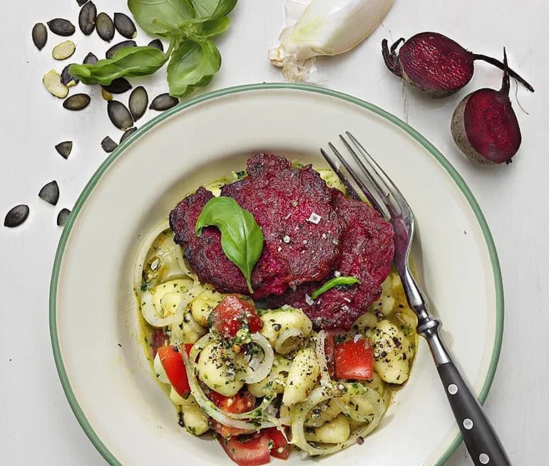 Bön- och rödbetsbiffar med pumpafröpistou, tomat och potatisgnocchi