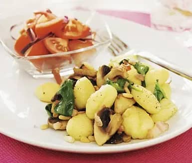 Potatisgnocchi med svamp, bacon och pinjenötter