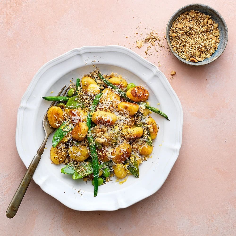 Stekt gnocchi med gröna bönor, pecorino och dukkah