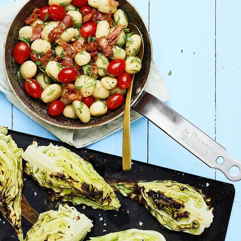 Krämig brysselkål med gnocchi och stekt sidfläsk