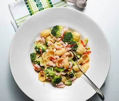 Gnocchi med räkor, broccoli, vitlök och chili
