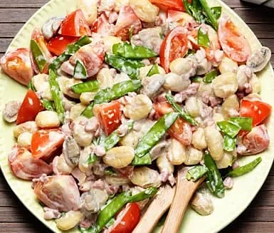 Potatisgnocchi med bacon, svamp och sockerärter