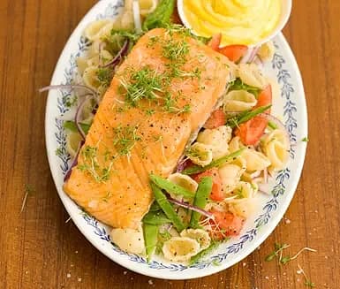 Gnocchi med sockersalt lax och saffransdipp