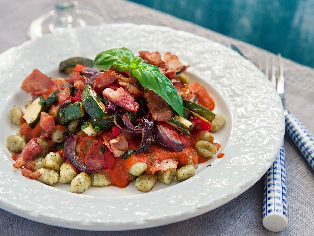 Gyllenstekt gnocchi med medelhavsgrönsaker och bacon