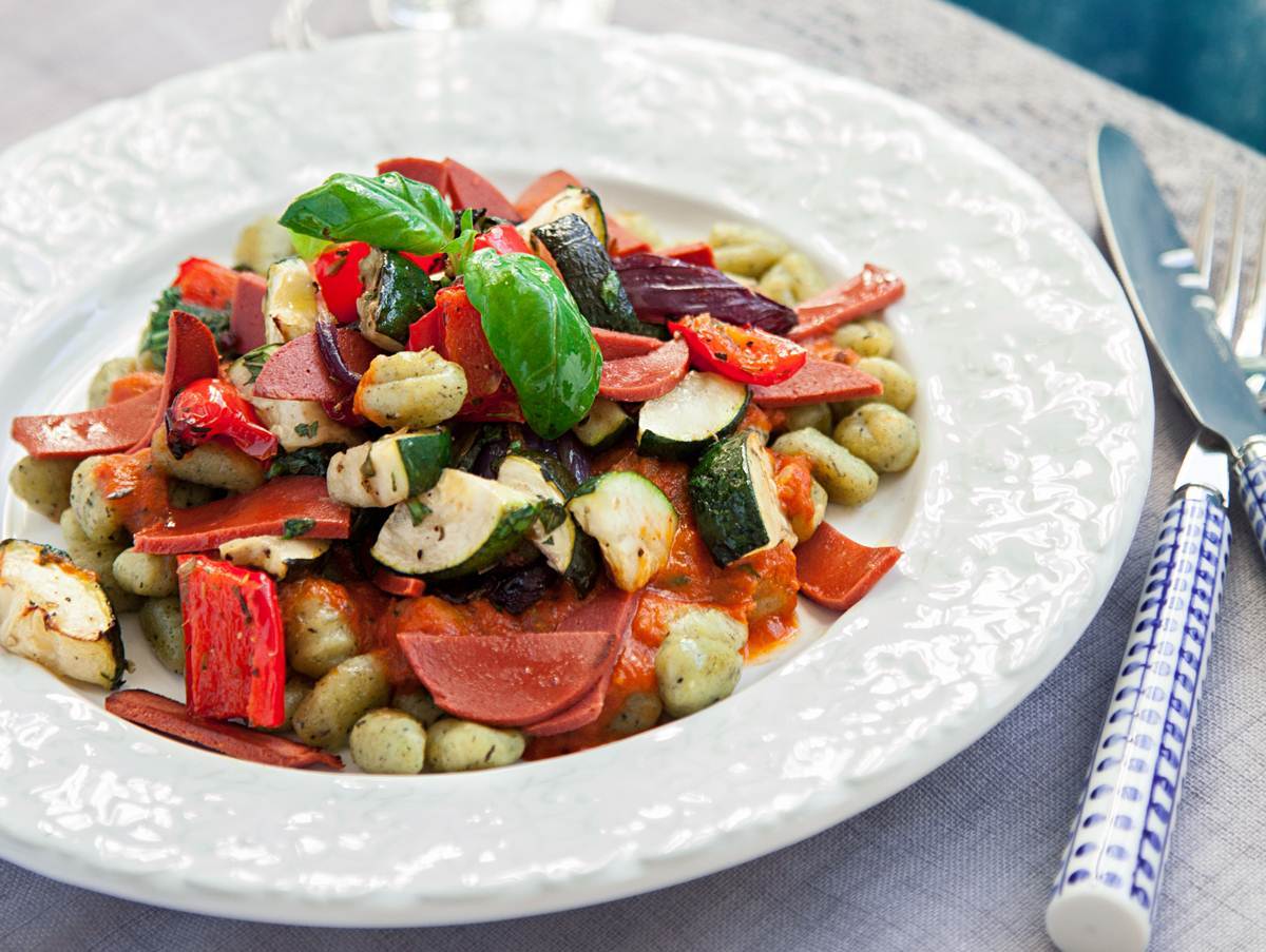 Gyllenstekt gnocchi med medelhavsgrönsaker och bejkon