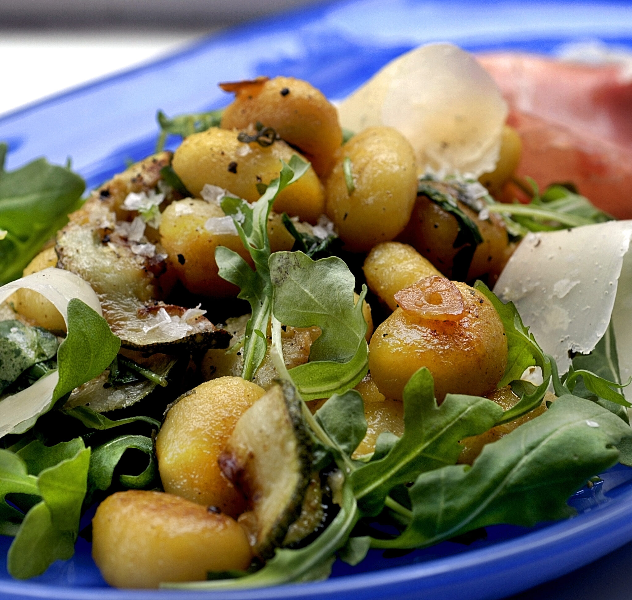 Stekt gnocchi med zucchini och persiljesallad