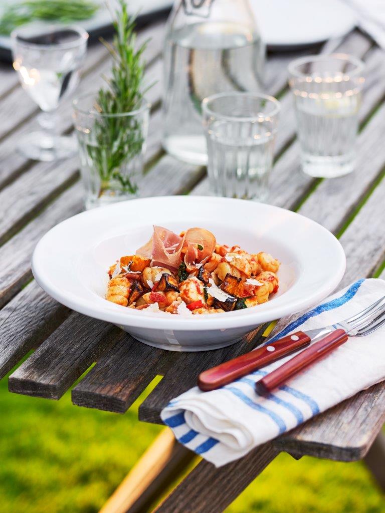 Gnocchi med het tomat- och auberginesås