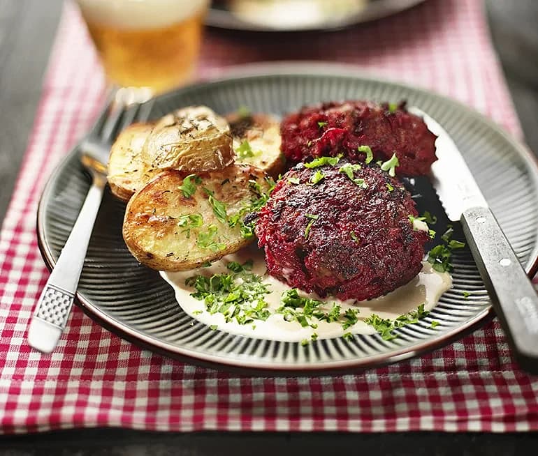 Kalvfärsbiffar med rödbetor, serveras med gräddsås och potatisskivor