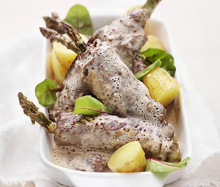 Sparris- och lövbiffsrullad med gräddsås