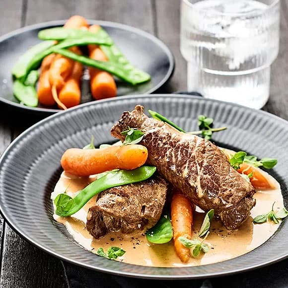Fyllda lövbiffsrullader i gräddsås med rostad rotselleri