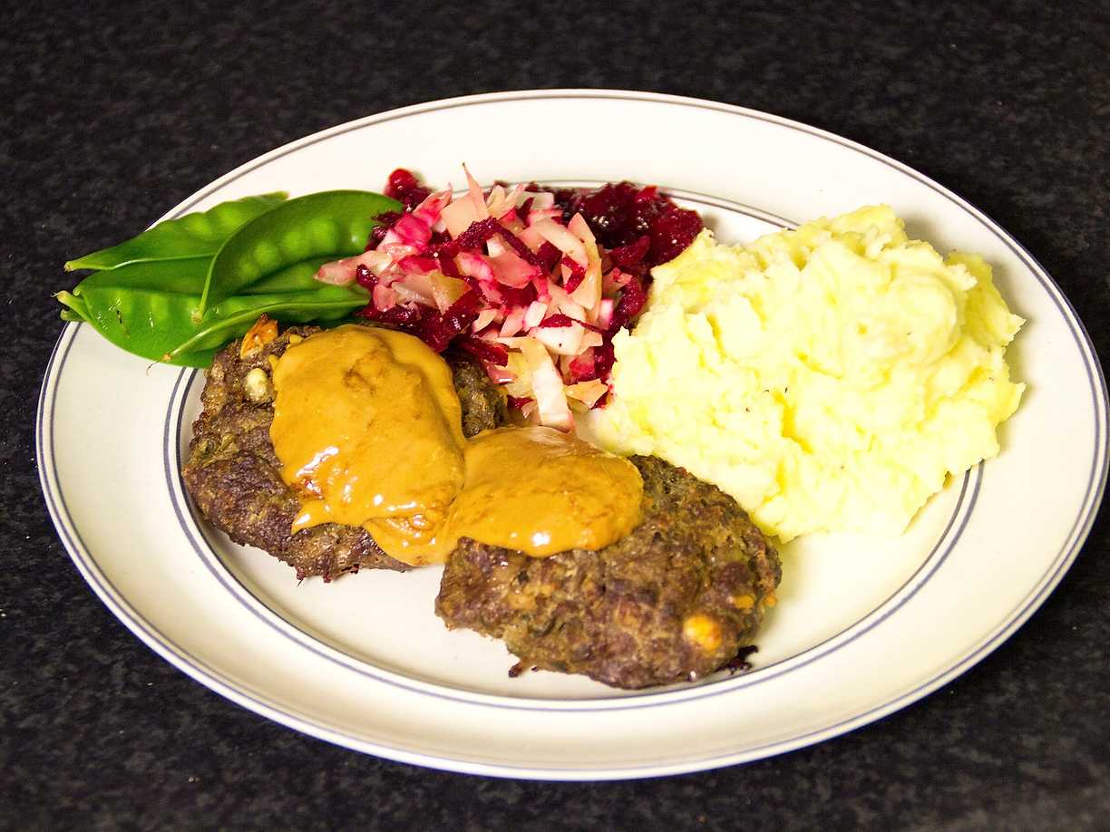 Nötfärsbiffar med rostade rotfrukter och gräddsås
