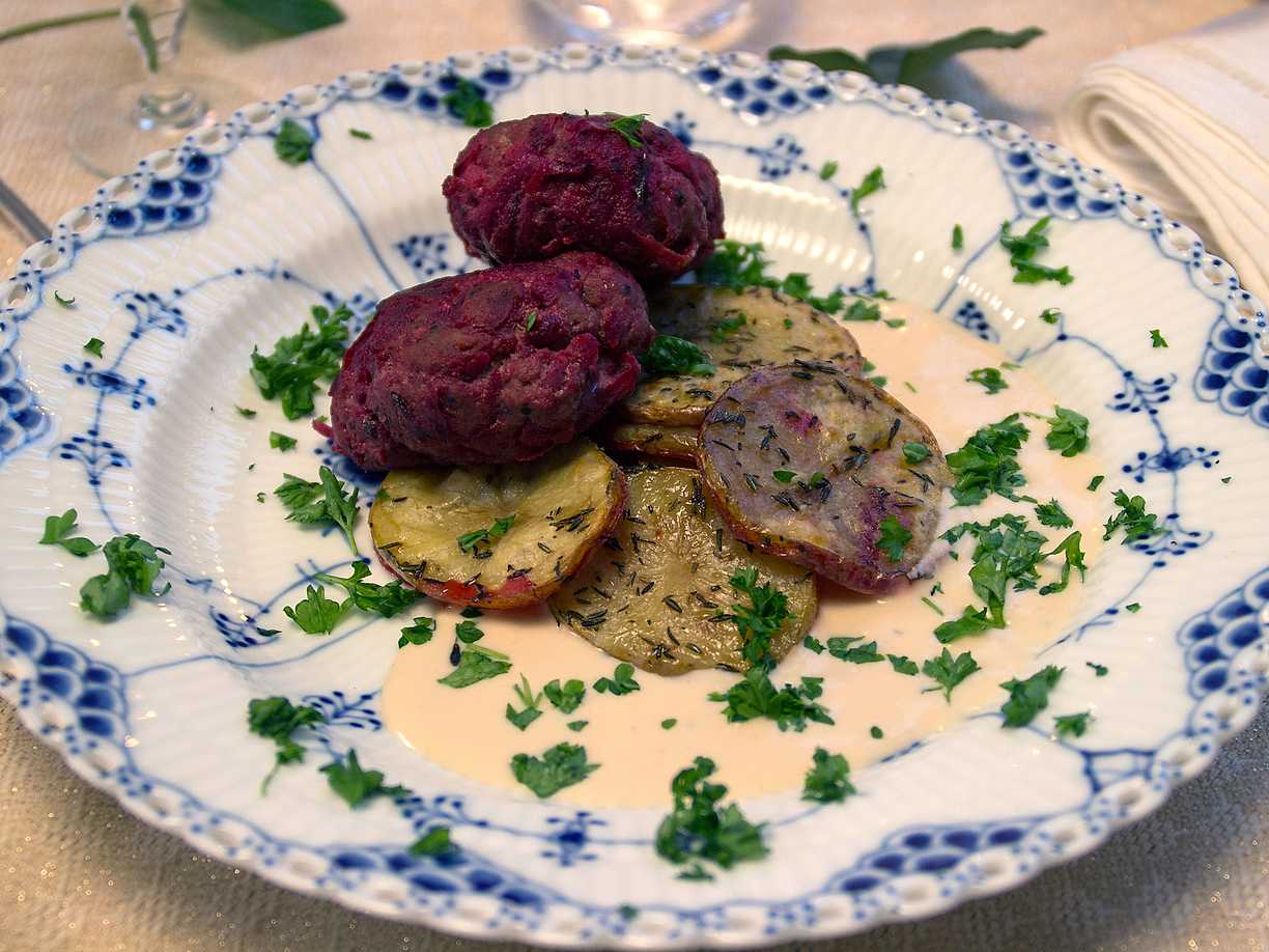 Vegobollar med hasselbackspotatis och örtig gräddsås