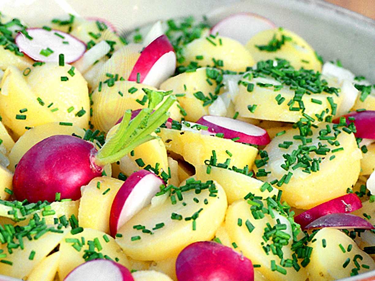 Sillsallad med äpple, mandelpotatis, gräslök och hasselnötter