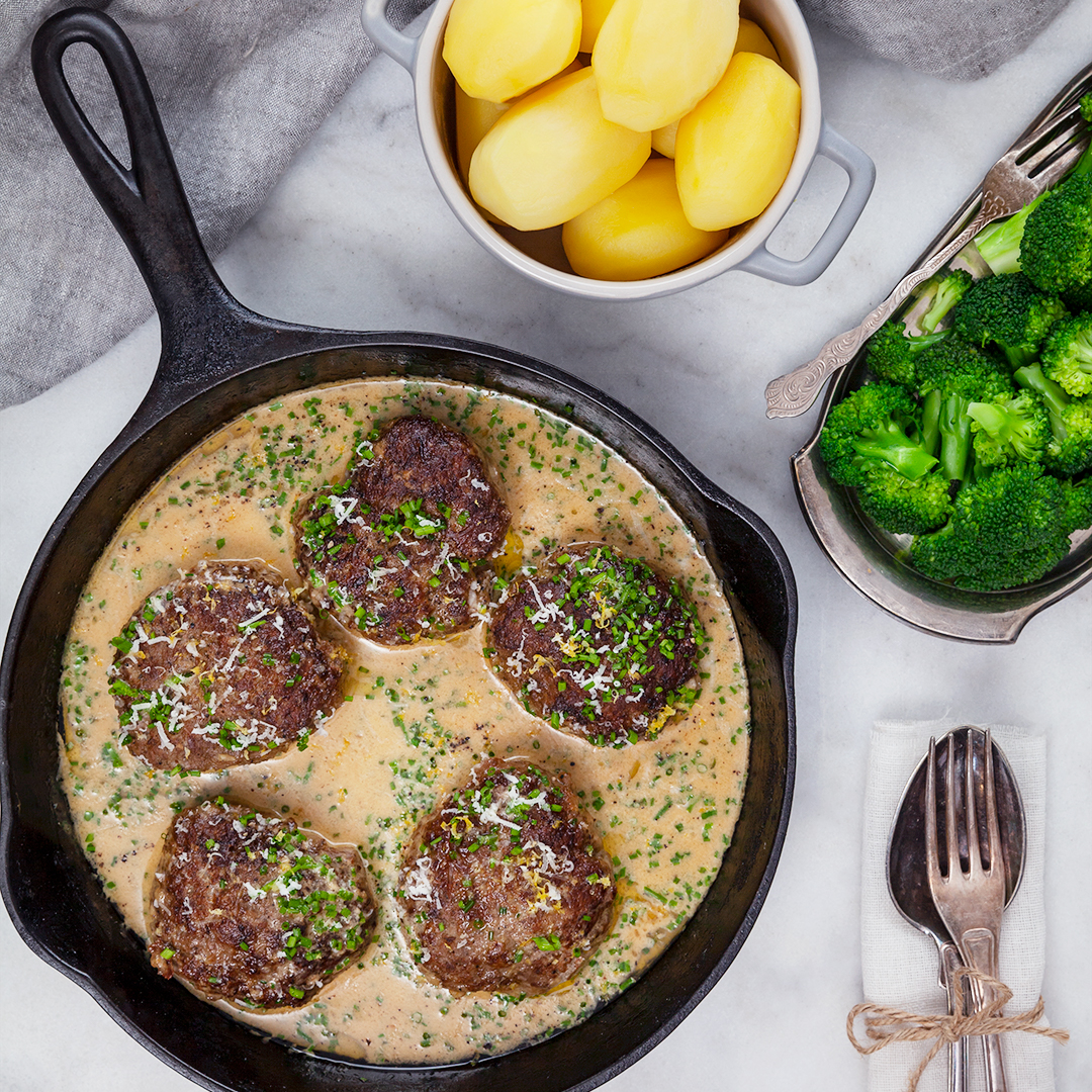 Ugnsgrillad lammkorv och potatis med gräslökssås