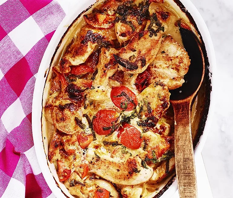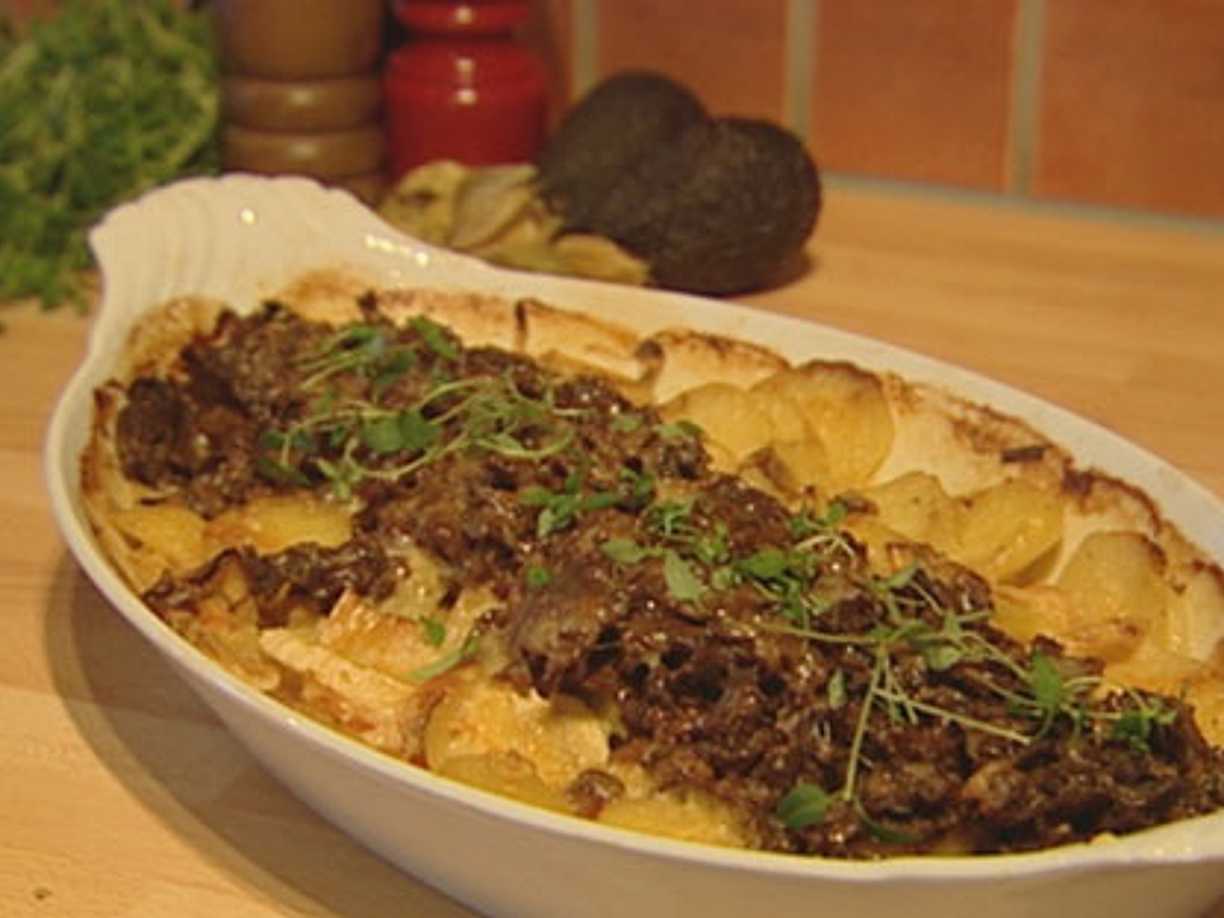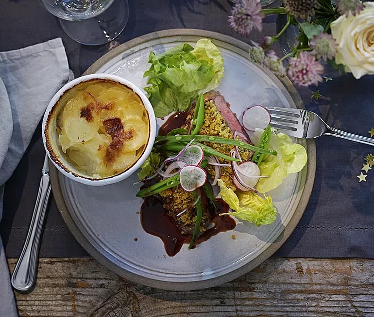 Parmesan- och basilikabakad ryggbiff med jordärtskocksgratäng