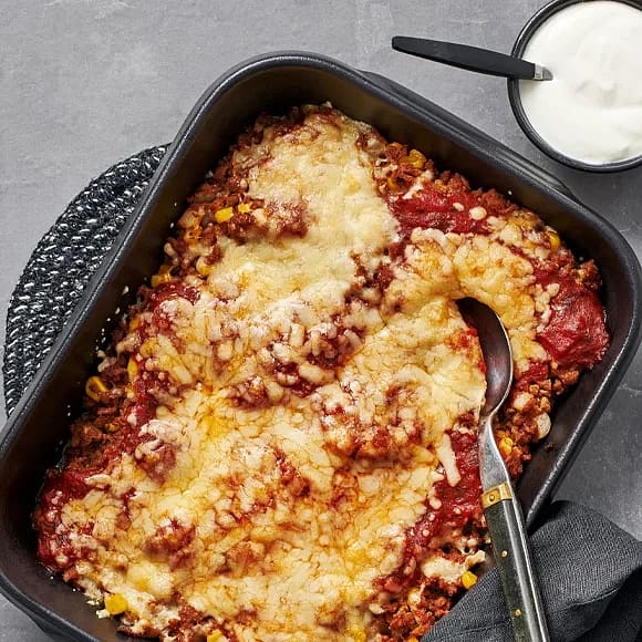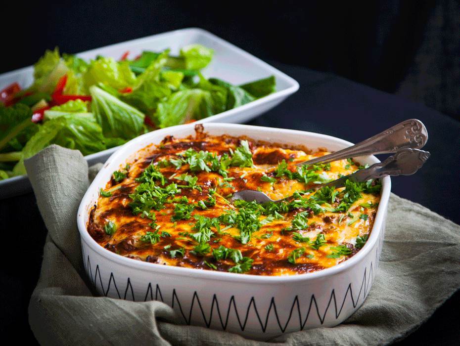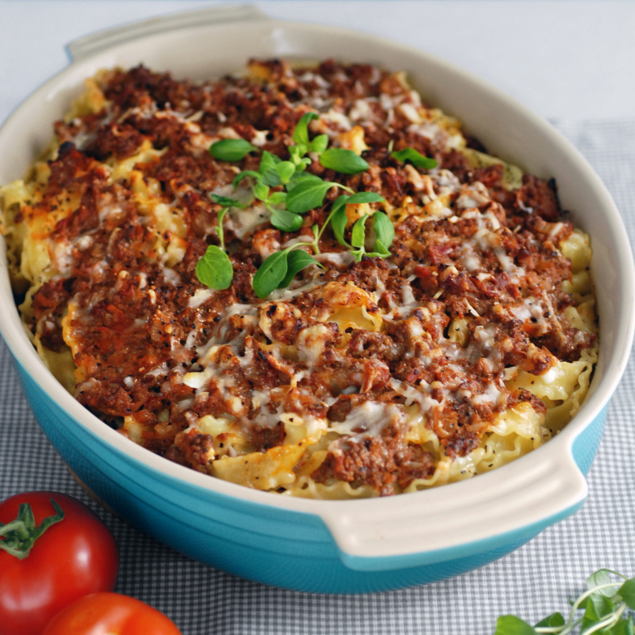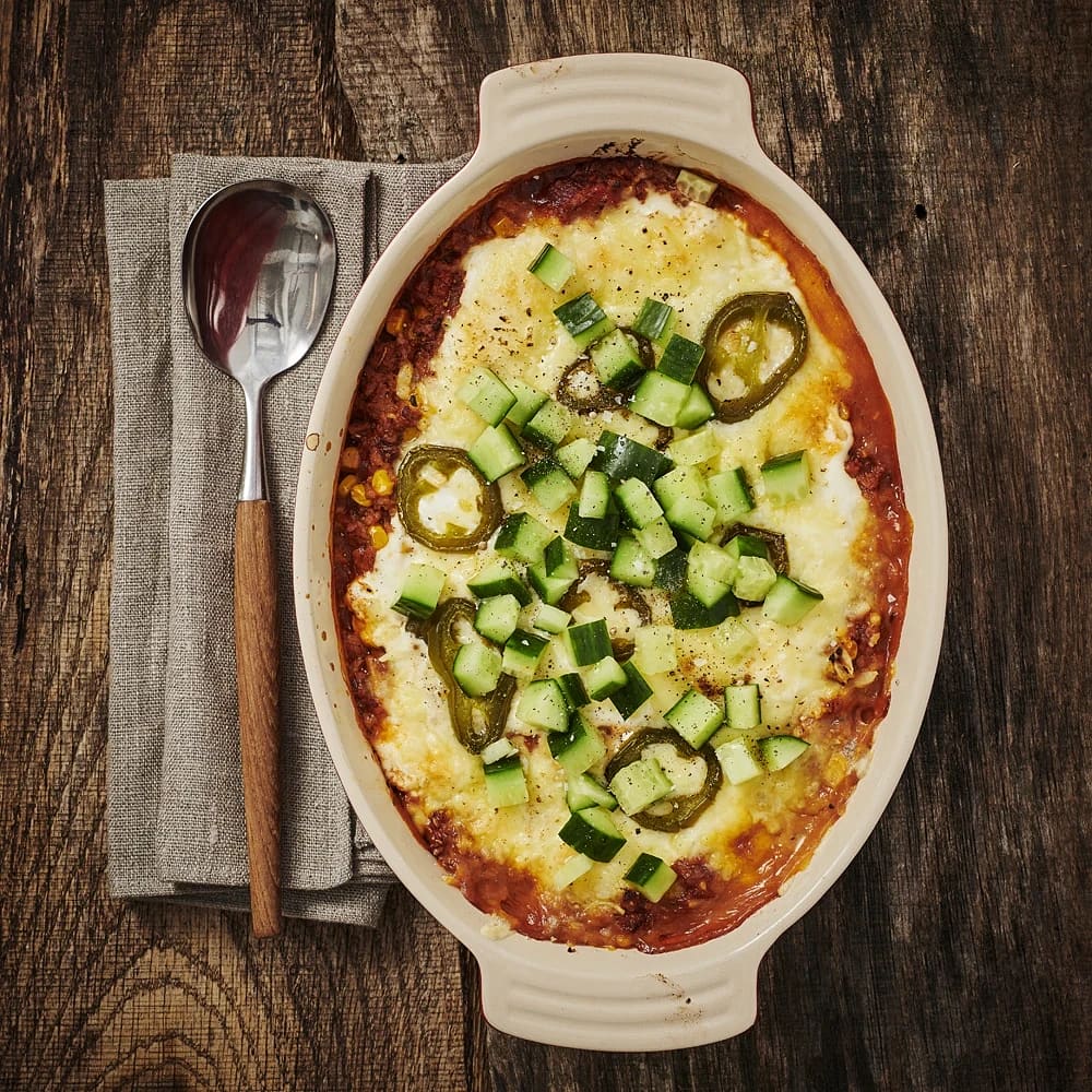 Köttfärs- och zucchinigratäng med blomkål och mozzarella