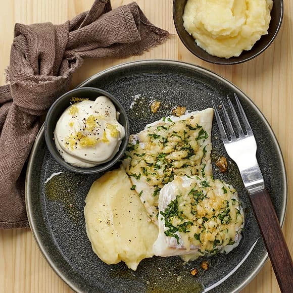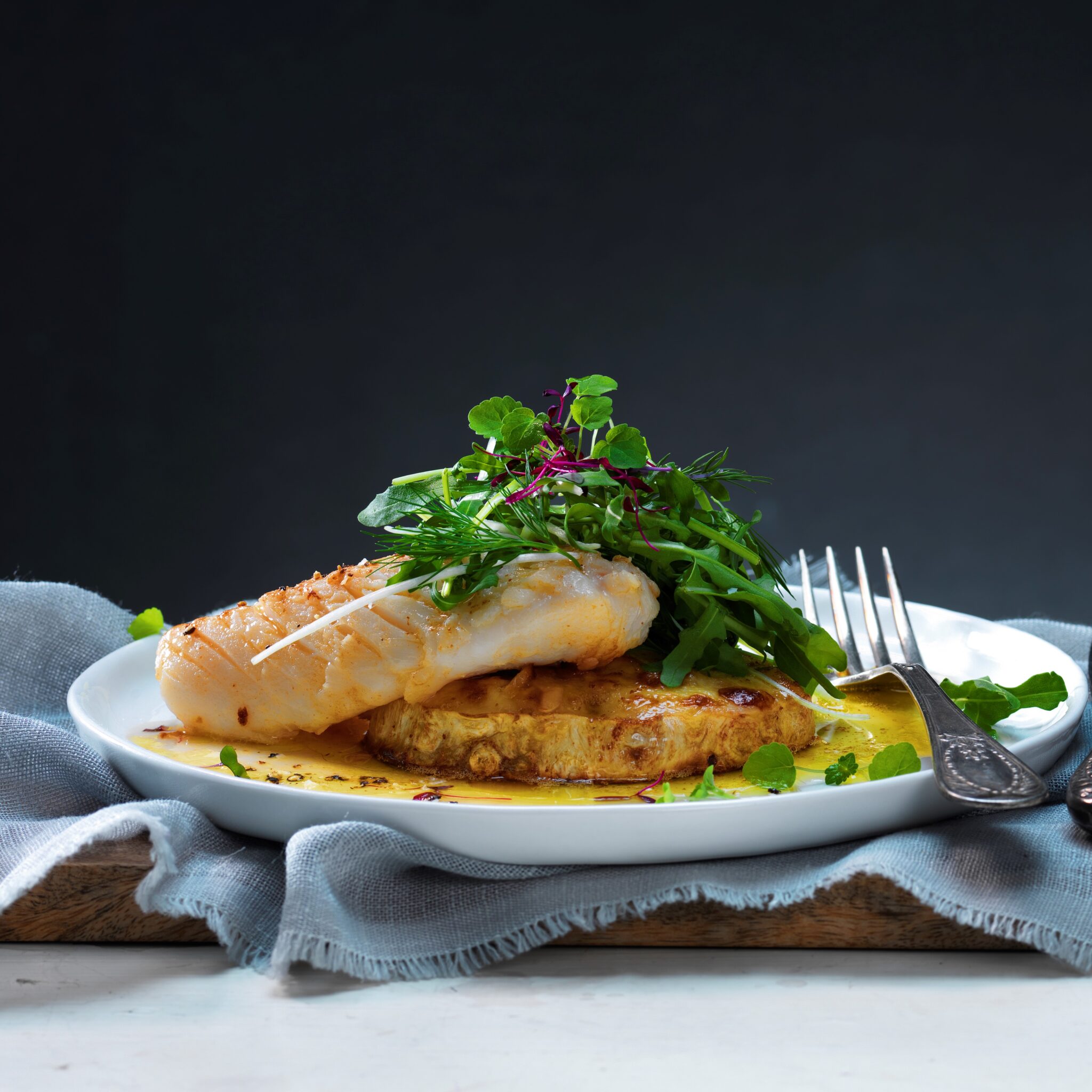 Fiskgratäng med mandel, potatistoppar, spenat och citron