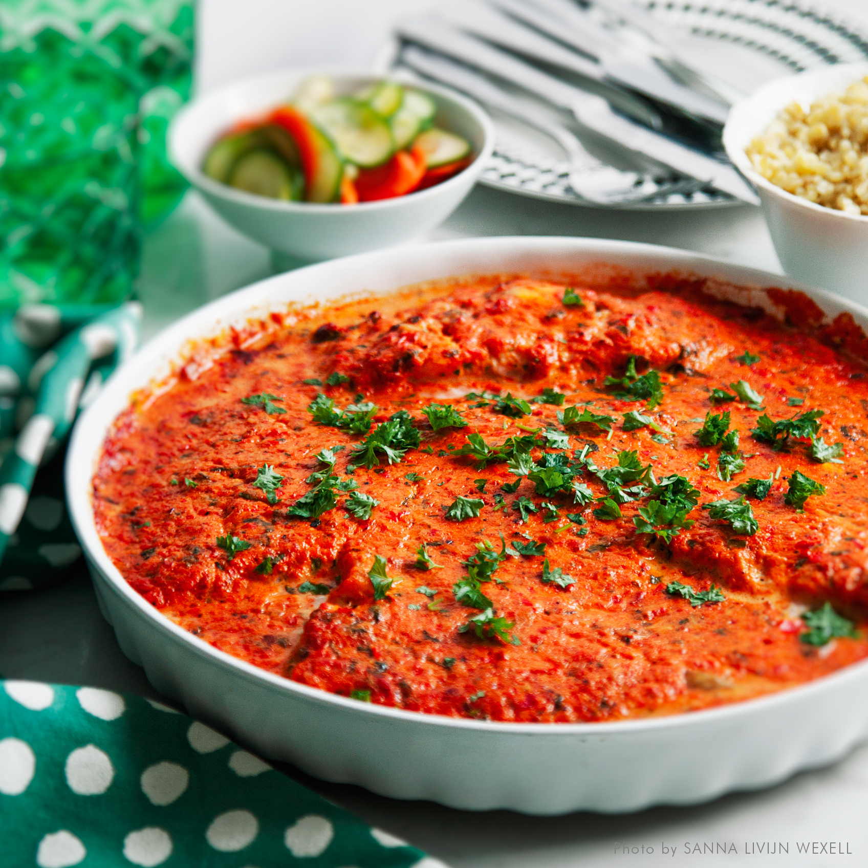 Chipotlegratinerad lax i ugn med lättkokta grönsaker